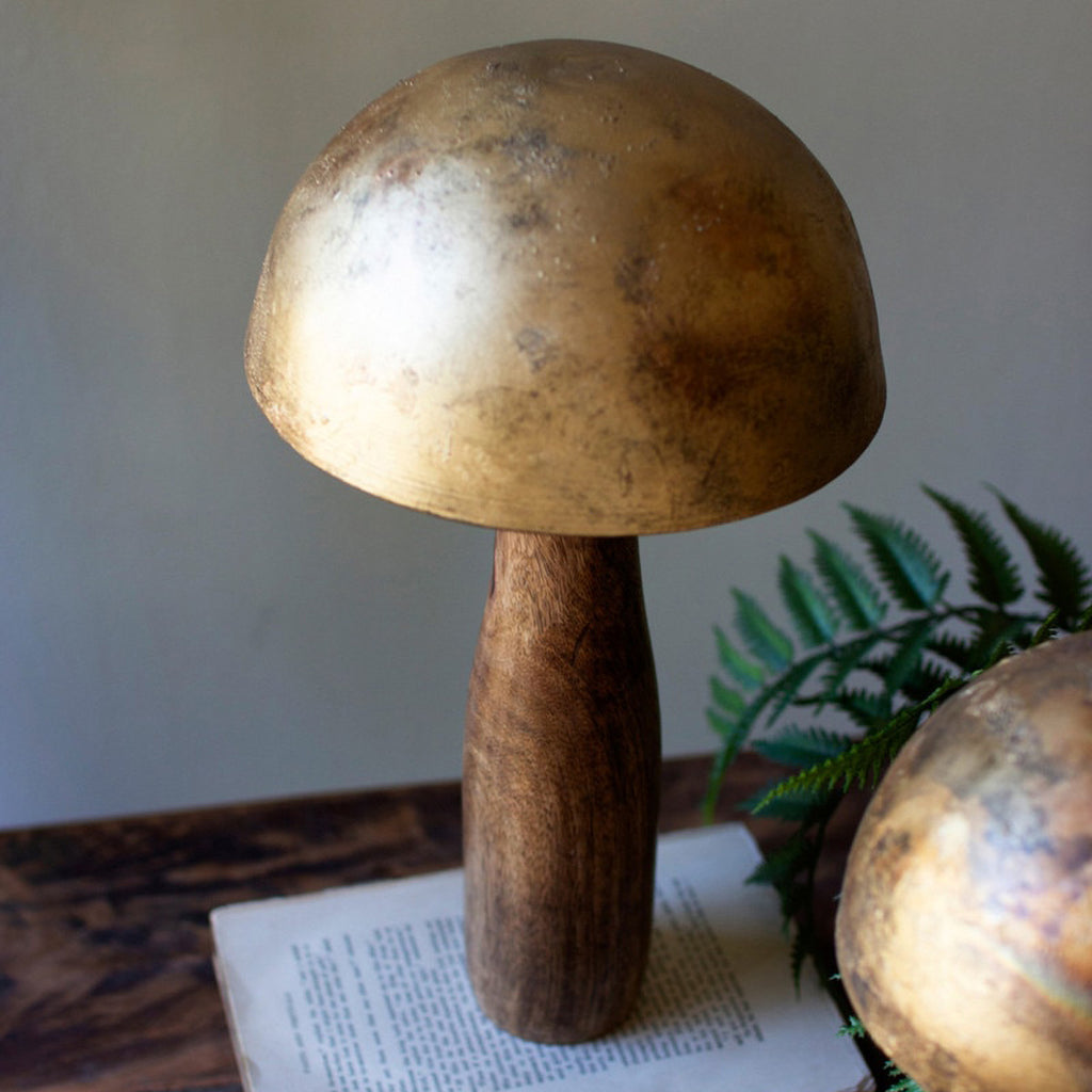 Split or group this set of three antique brass mushrooms with wooden bases. These go with toadstools or other fungi sets. Enjoy this trio anywhere.
