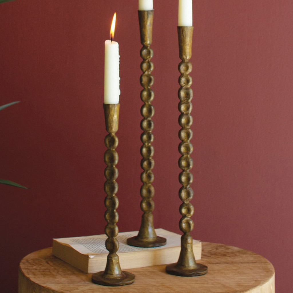 Add height to your centerpiece or mantle with this set of three. Made of antique brass in India, this set holds one taper candle each. Fill it with colorful tapers for the holidays or year-round.
