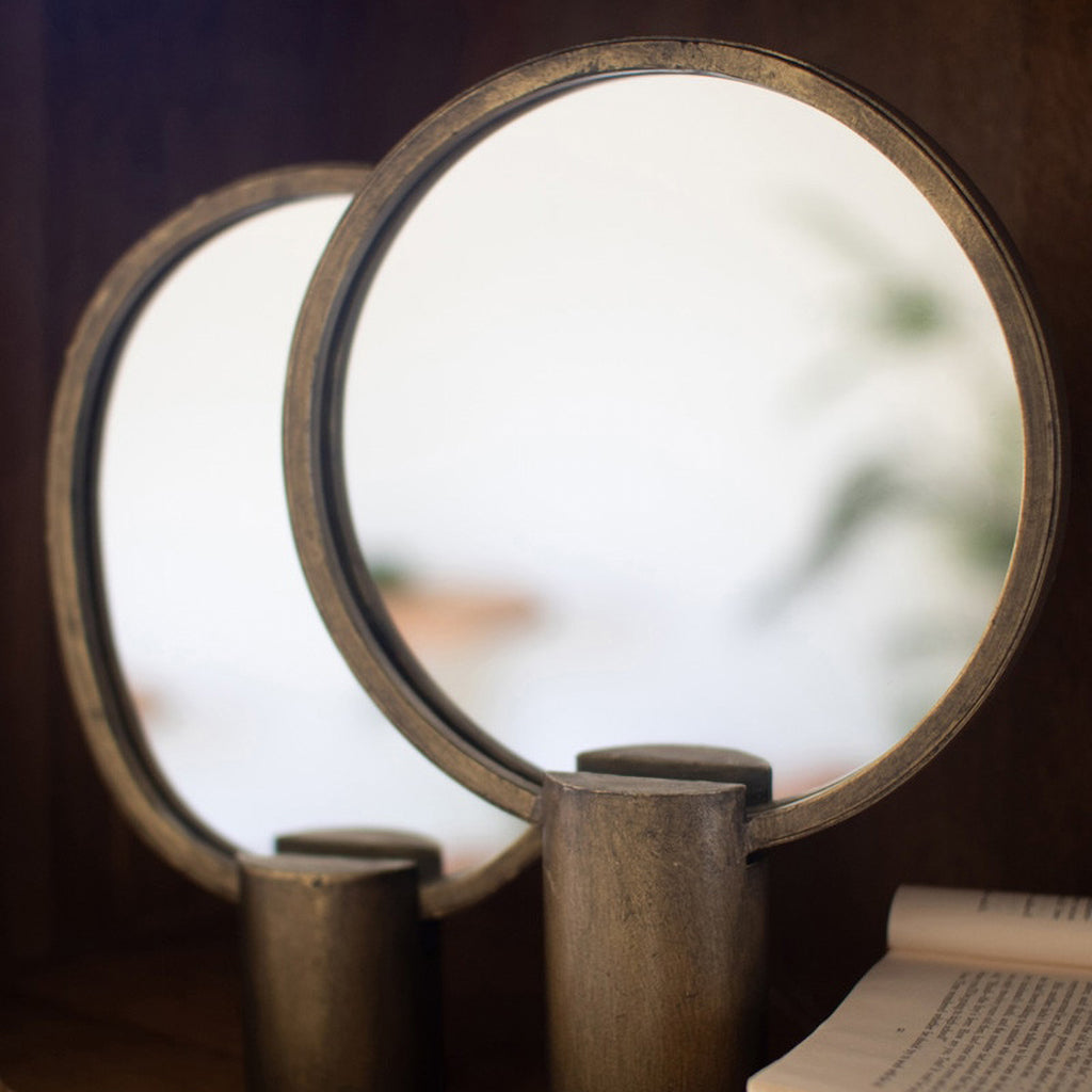 This set of two tabletop mirrors is great for the whole family. Use them for shaving or makeup in the bathroom or as light catchers in a small space. Made of metal and antique brass, this set comes with one of each size and shape.