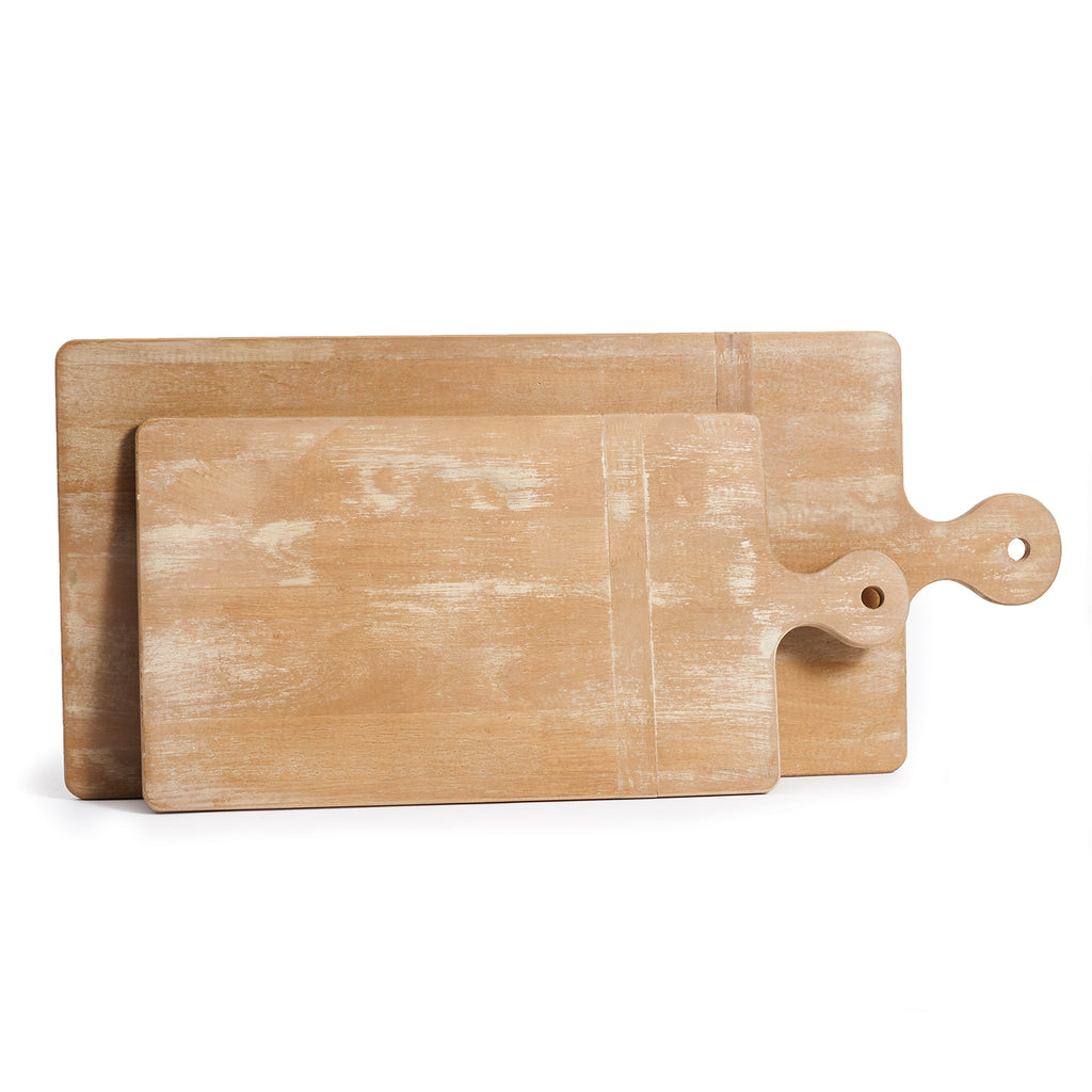 Inlaid wood detail and a warm gray wash make these cutting boards particularly special. Leaning against a backsplash or hung on the wall, a traditional look for kitchen or dining room.