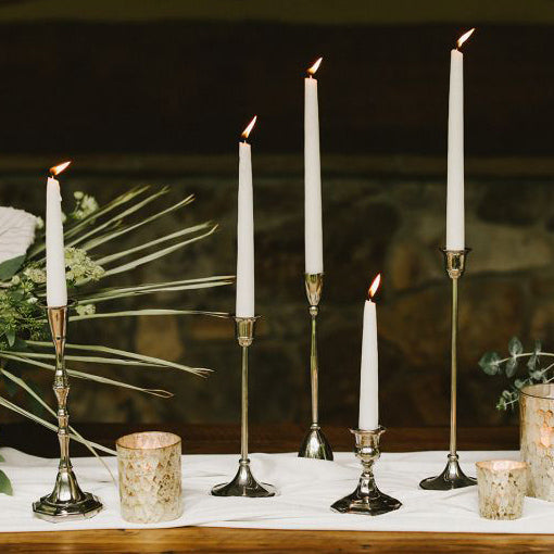 Each Antique Candlestick features a classic round foot that tapers up to a slim stem and is topped off with a perfect cup for holding a taper candle.