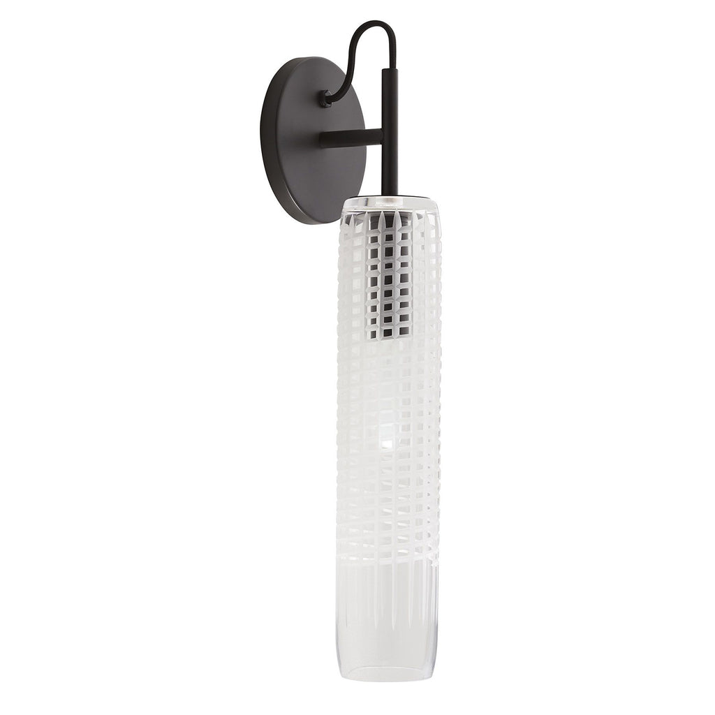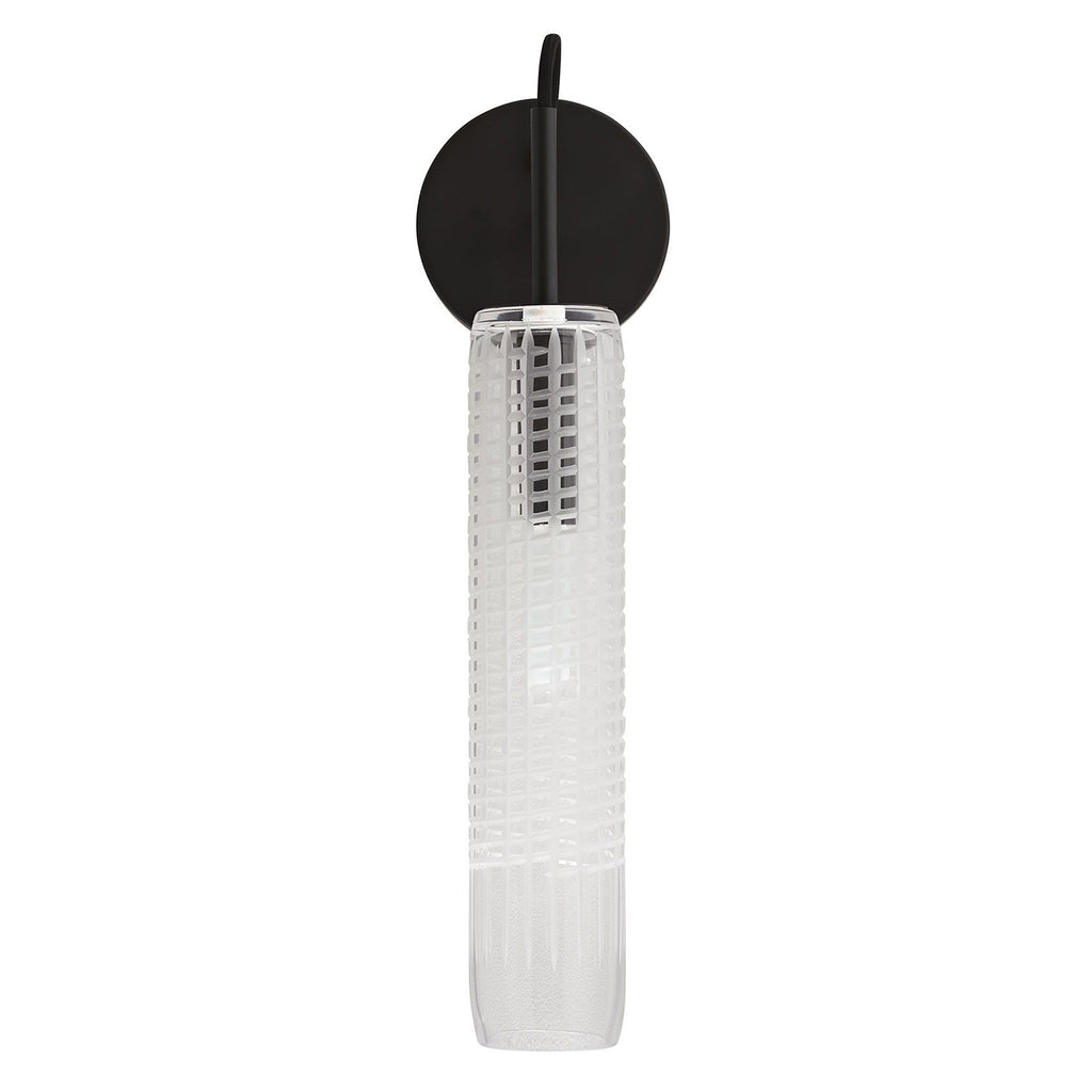 Arteriors Home lighting embodies the perfect balance of form and function, creating an ambiance that is both captivating and inviting. With an emphasis on functionality, versatility, and visual appeal, the Arteriors Home wall sconce fixtures embrace both form and function, elevating any environment with timeless allure. The Arteriors Cut Tall Sconce is a study in circular and cylindrical forms. The Sconce's clear etched-glass shade is reminiscent of cut crystal, offering a contemporary twist on a timeless technique. The long, narrow shade's deeply grooved texture casts beautifully patterned light and shadow. With a focus on material connections, the Sconce's cylindrical glass shade cuffs its blackened steel top, which is suspended from a metal armature, with a draped black cloth cord detail.