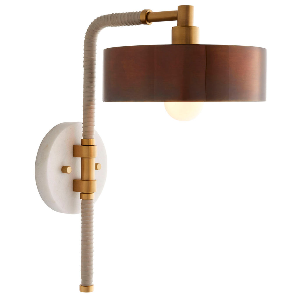 This contemporary sconce possesses a modern sensibility defined by a sleek style and masterly materials. A heritage brass steel frame wrapped in gray leather is perfectly presented from a circular black marble backplate, and a bronze steel drum shade directs light for a striking contrast. Marble will vary. Certified for damp locations and intended for interior use.