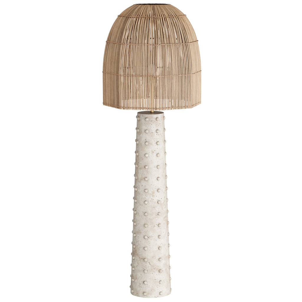 The perfect pairing of playful materials. Inspired by traditional thatched roofs, the agnes is topped with an unlined shade of natural coco rib that allows light to playfully permeate any space. A gently tapered base of mactan stone finished resin delights the eye with textural details of beaded spheres. Accented with antique brass hardware. Clear silver cord and on/off rotary switch. Finish will vary.