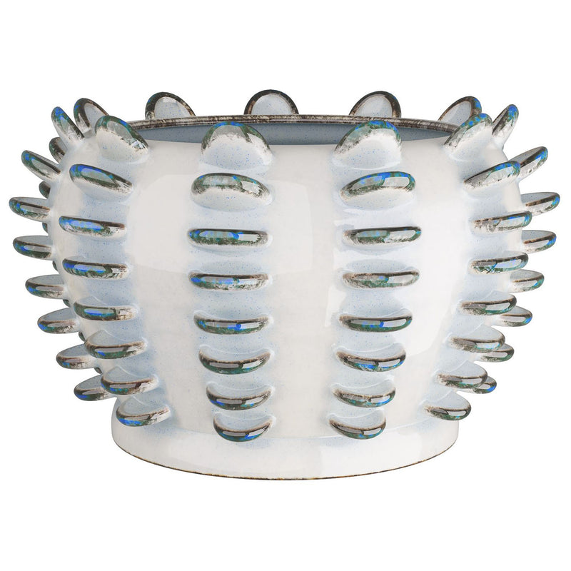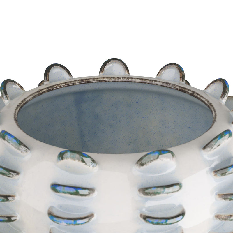 With a silhouette like a spiny sea urchin, a substantial porcelain vase is the perfect home for your favorite blooms. Finished with a marine-inspired glaze of reactive blue that moves from deep to shallow tones towards the edges of each textural accent. Finish will vary.