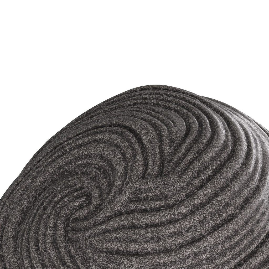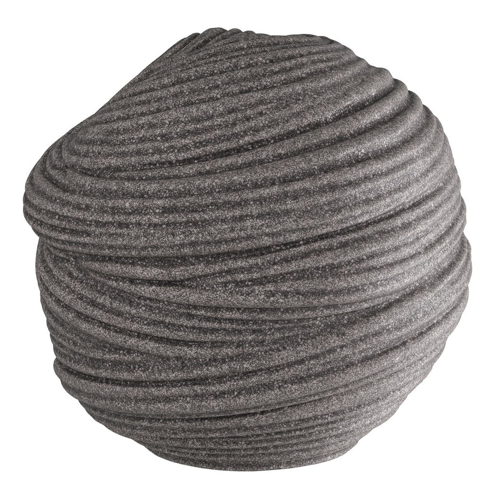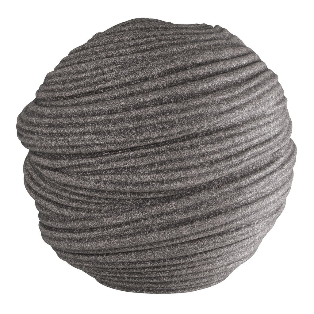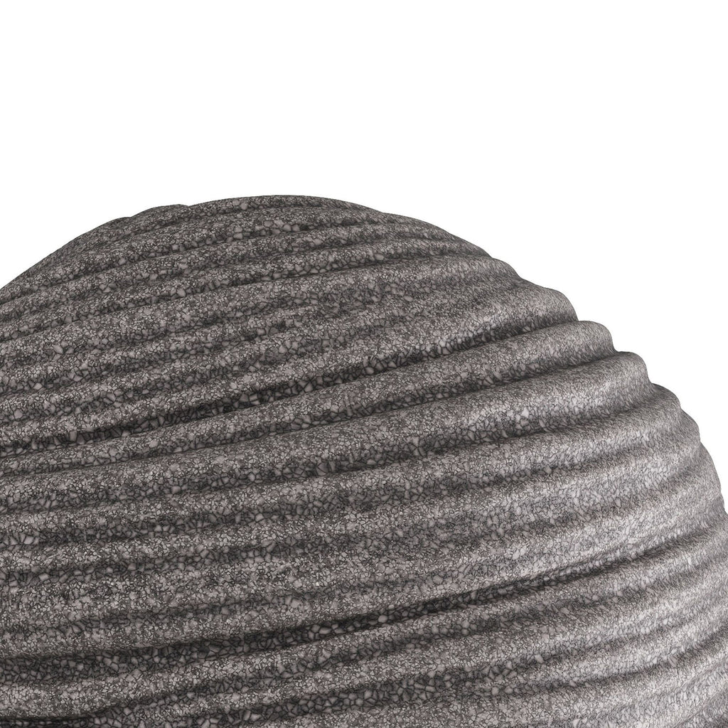 An orb of carved charcoal ricestone composite is grooved and patterned to delight the eye. Textural and soothing, its swirled surface provides a sense of grounding to the eye. Finish will vary.