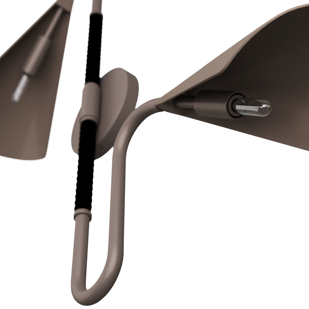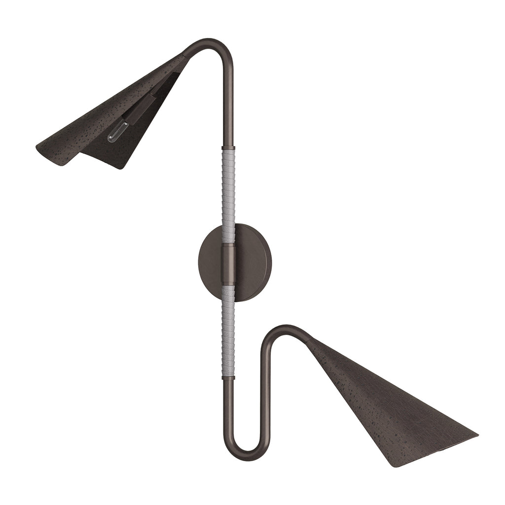 The double-tasking Arteriors Amerson adds a masculine, mid-century vibe to any room. Designed with two aerodynamic shades of english bronze steel that pivot for customizable illumination. English bronze arms are wrapped in graphite leather with an english bronze steel back plate on the wall. Damp-rated, although limited covered outdoor conditions may affect finish. Finish will vary.