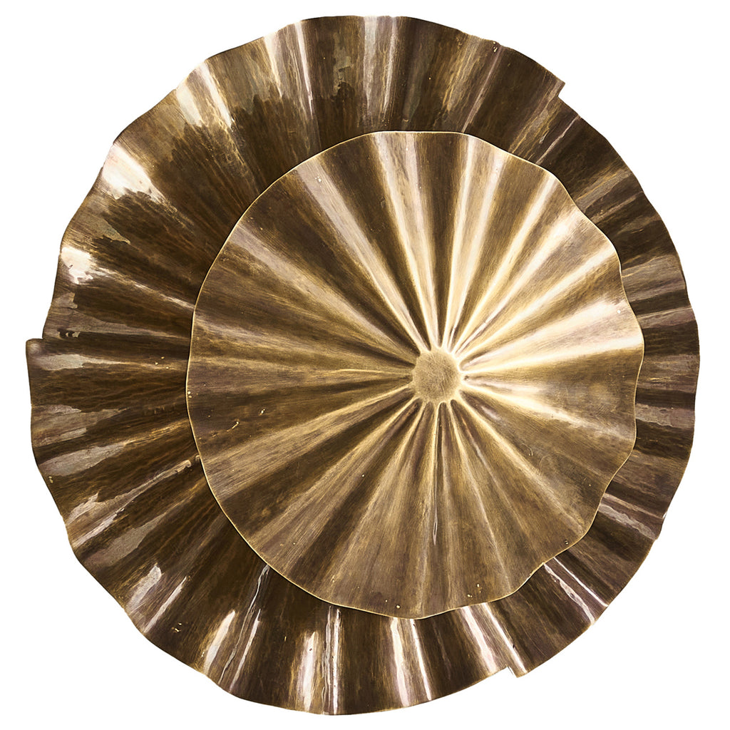 The natural fluted texture of gingko leaves informed our organically appealing fixture of vintage brass. The Arteriors Annabeth Wall Sconce has two staggered layers delivering an extra play of light and shadow. This clever design can be used as a flush mount or as a sconce. Damp-rated, although limited covered outdoor conditions may affect finish. Finish will vary.