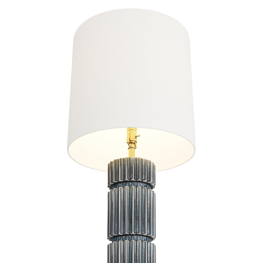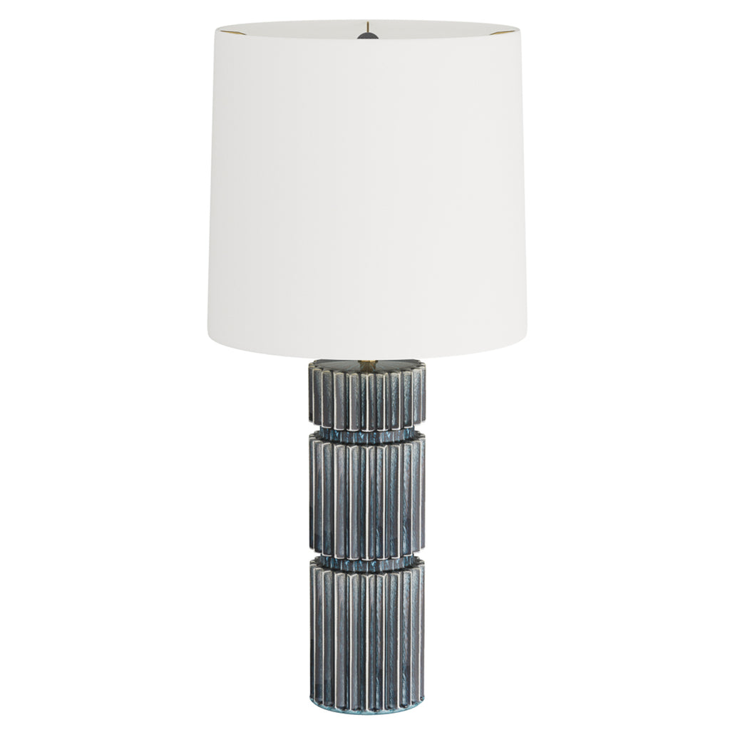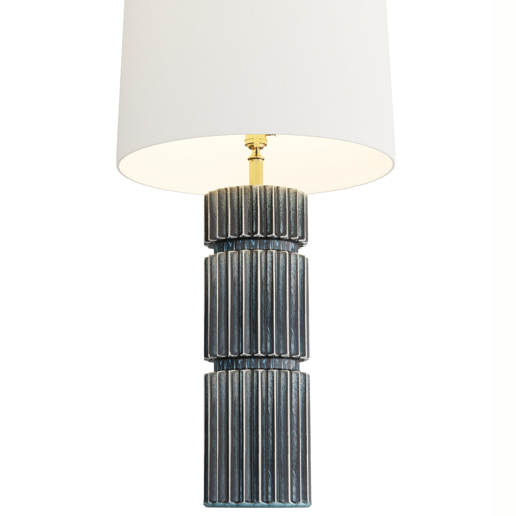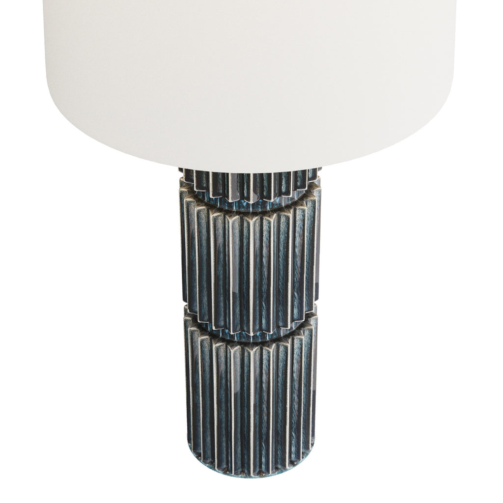 Sculpted in ceramic and finished in a reactive glaze of ocean, the Arteriors Annika’s textural fluting is reminiscent of mechanical gears. Accented with an antique brass finished support and an off-white linen drum shade, it delivers the perfect marriage of industrial and modern design. Matching ocean ceramic finial, clear silver cord, and three-way rotary switch. Finish will vary.