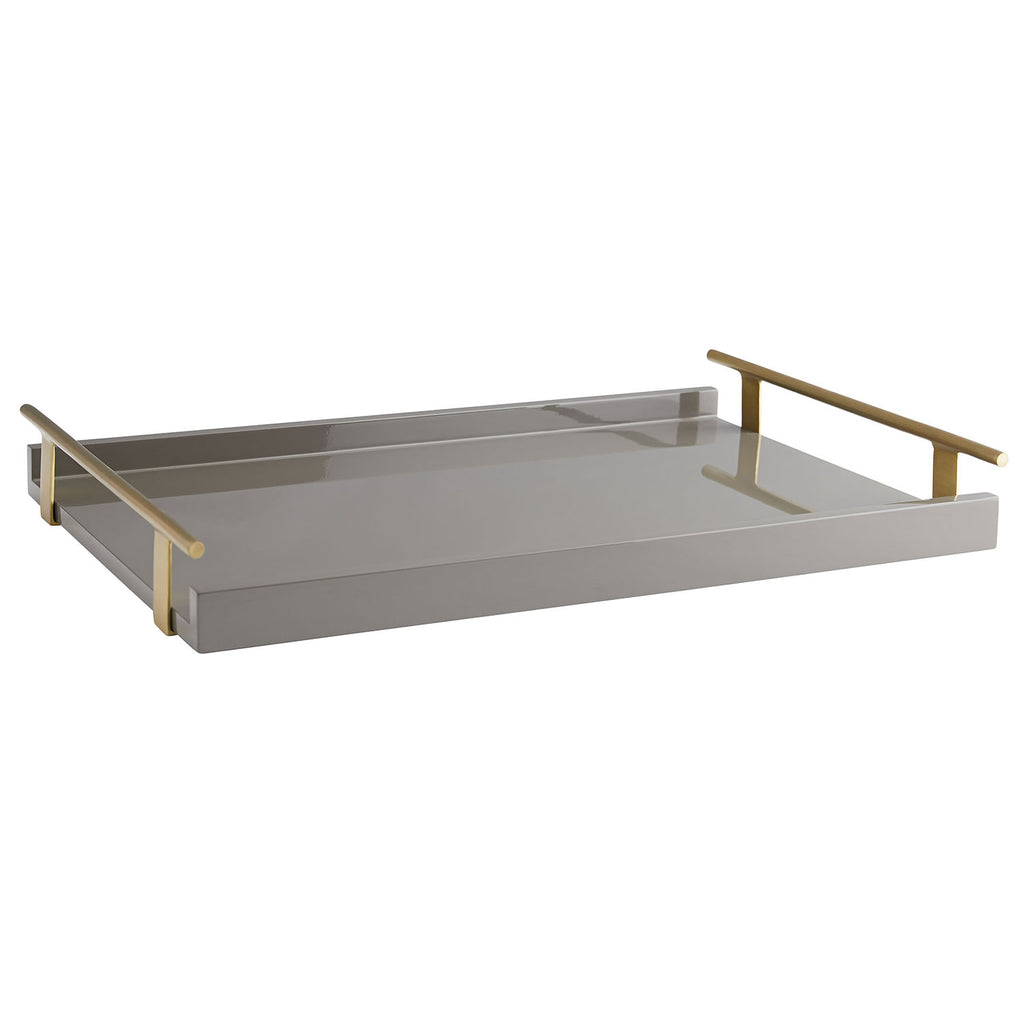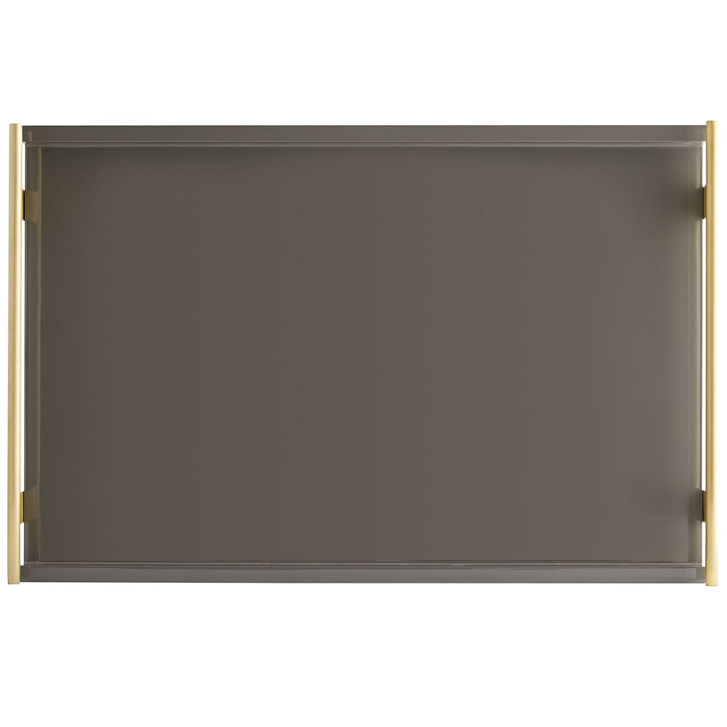 Form meets function to create this modern serving tray. A Chateau Gray lacquer finish is balanced by antique brass handles that offer a practical and polished appeal—an optimal serving piece when hosting casual or formal functions.