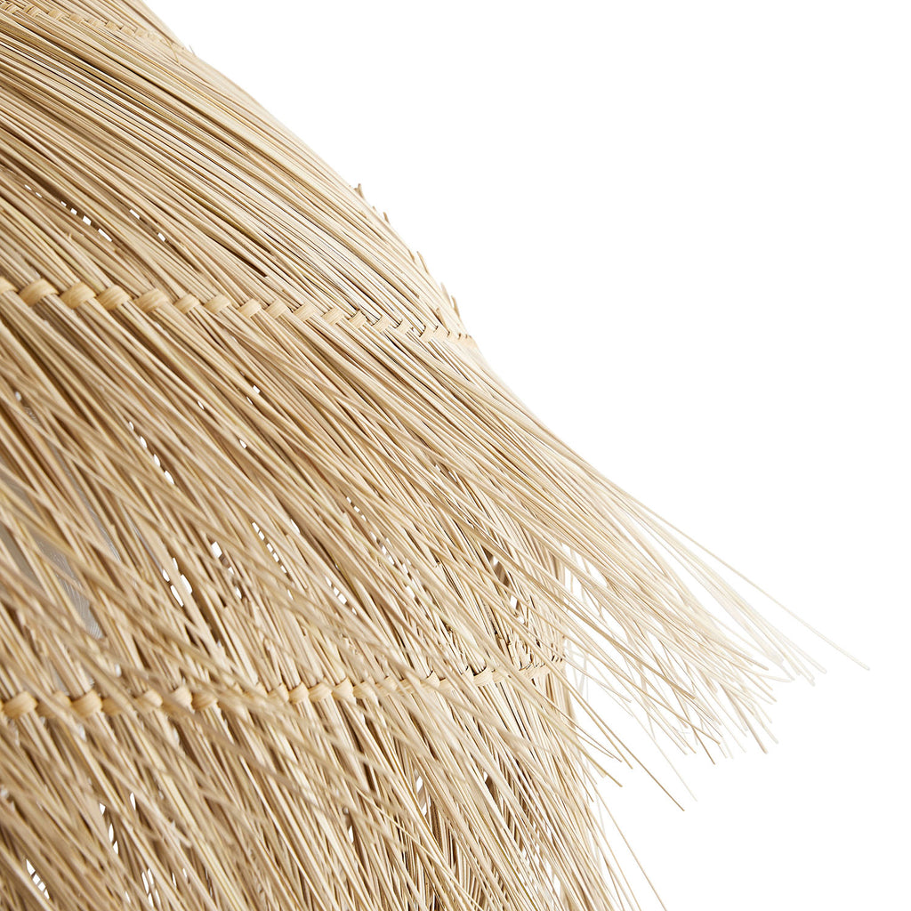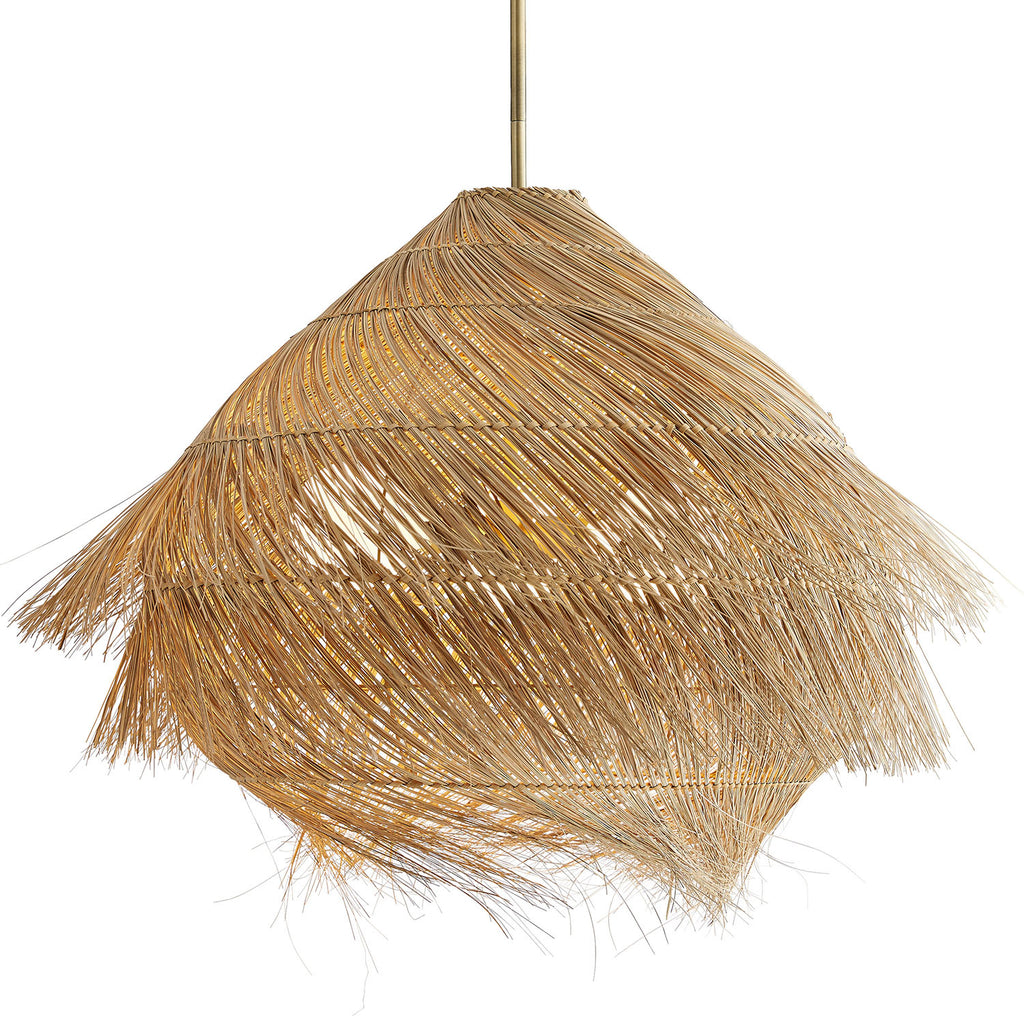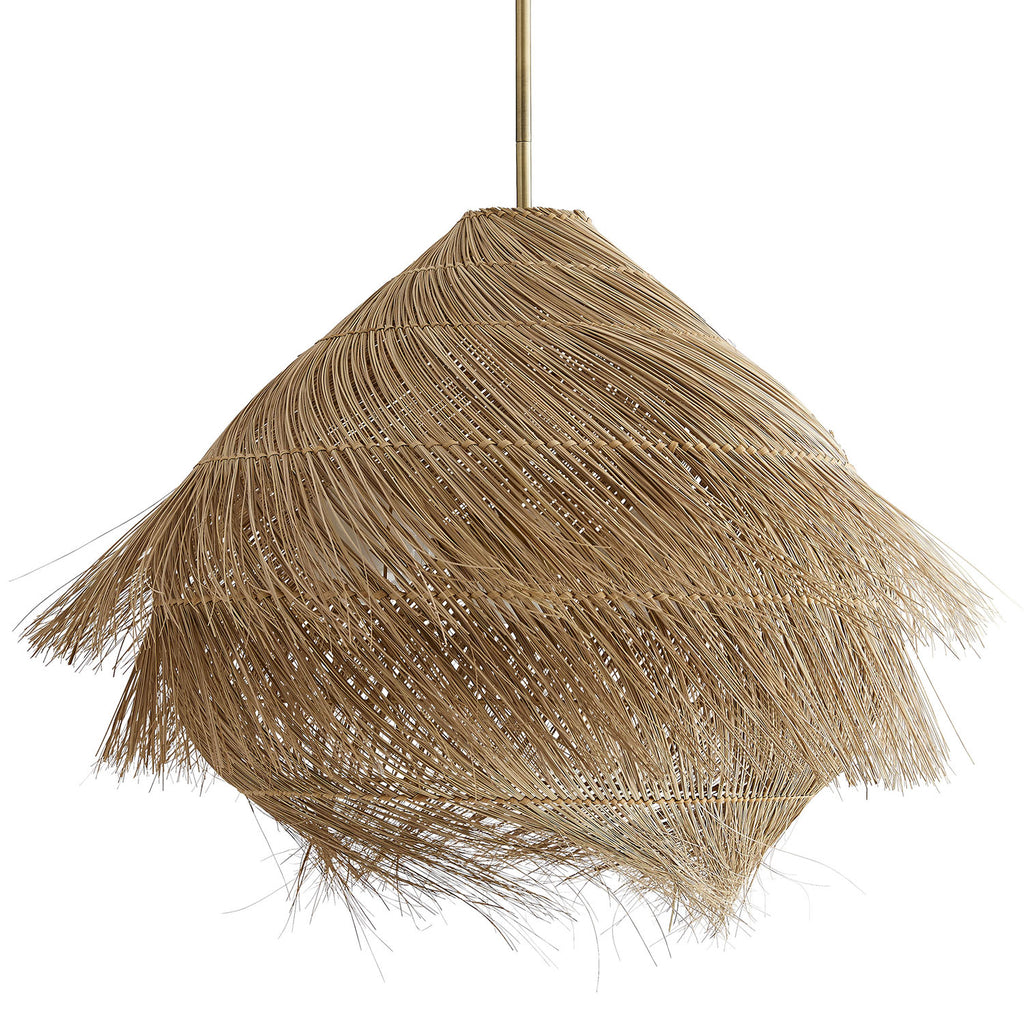 Boasting a beautiful organic form, the Ashburn Pendant establishes a strong presence in a space while remaining light and airy. The spheroid frame is crafted from natural buri midribs that are woven in a way that they appear to whirl around the iron frame, especially when in use. Paired with an antique brass pipe for an unexpected element that refines its organic form.