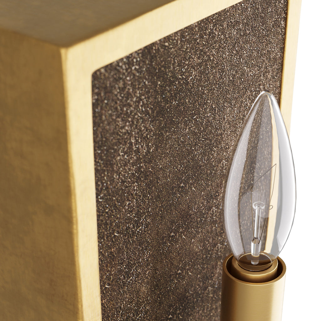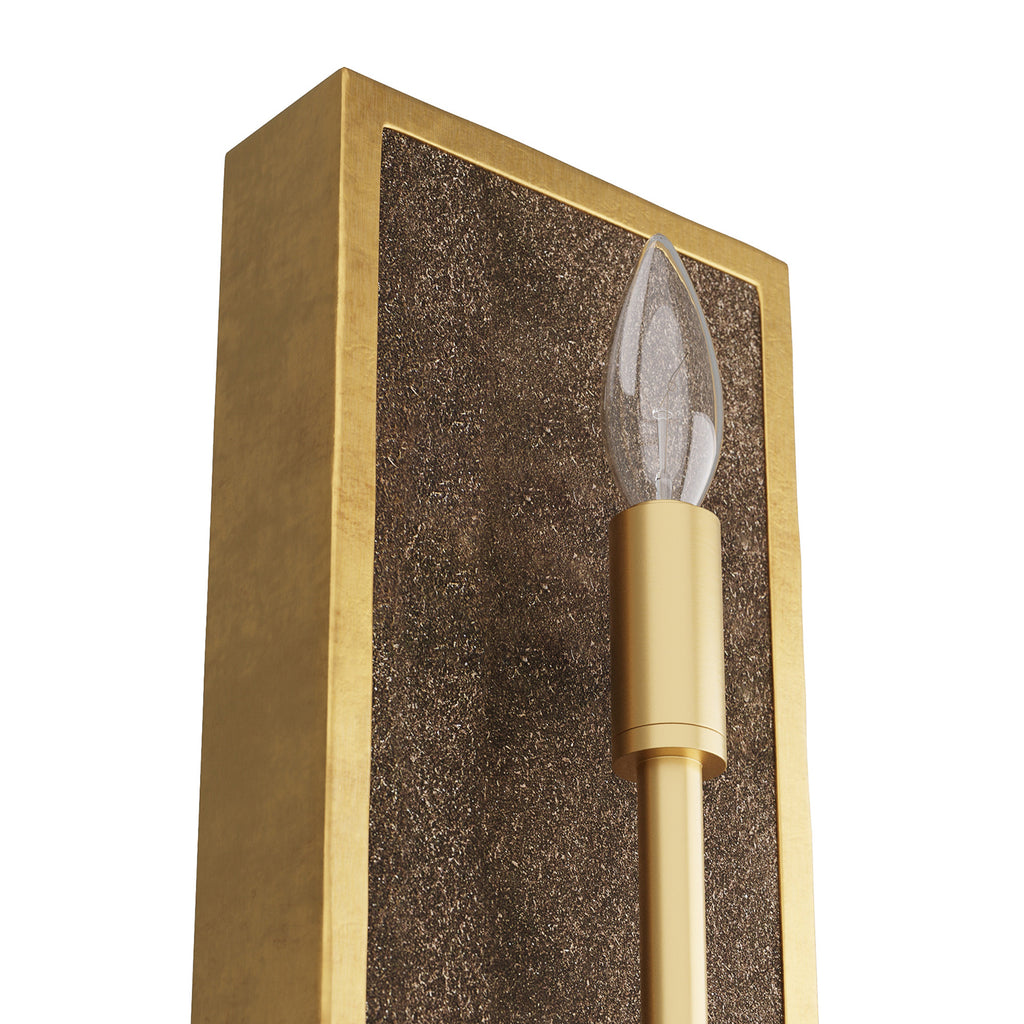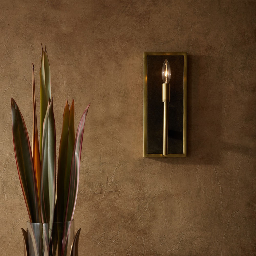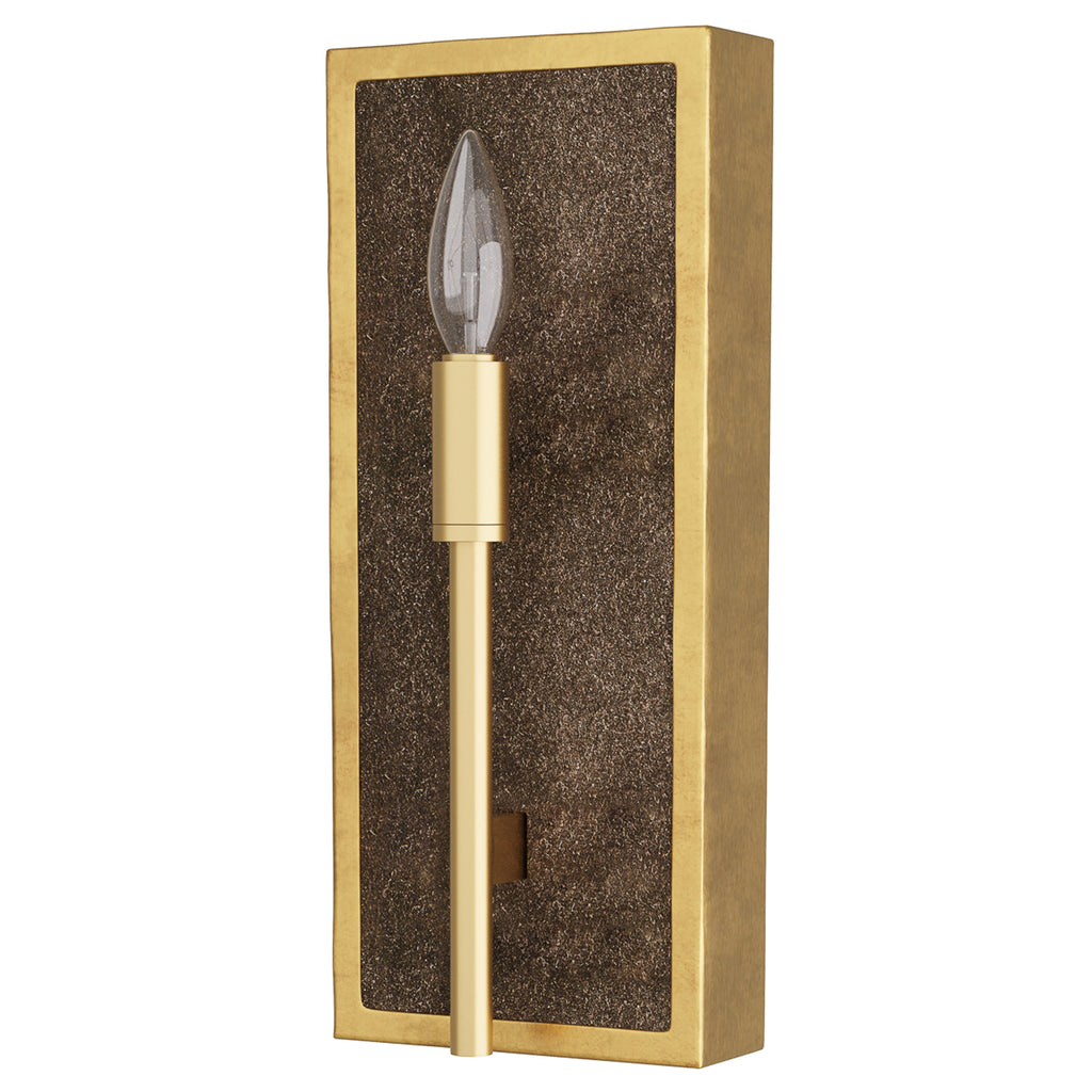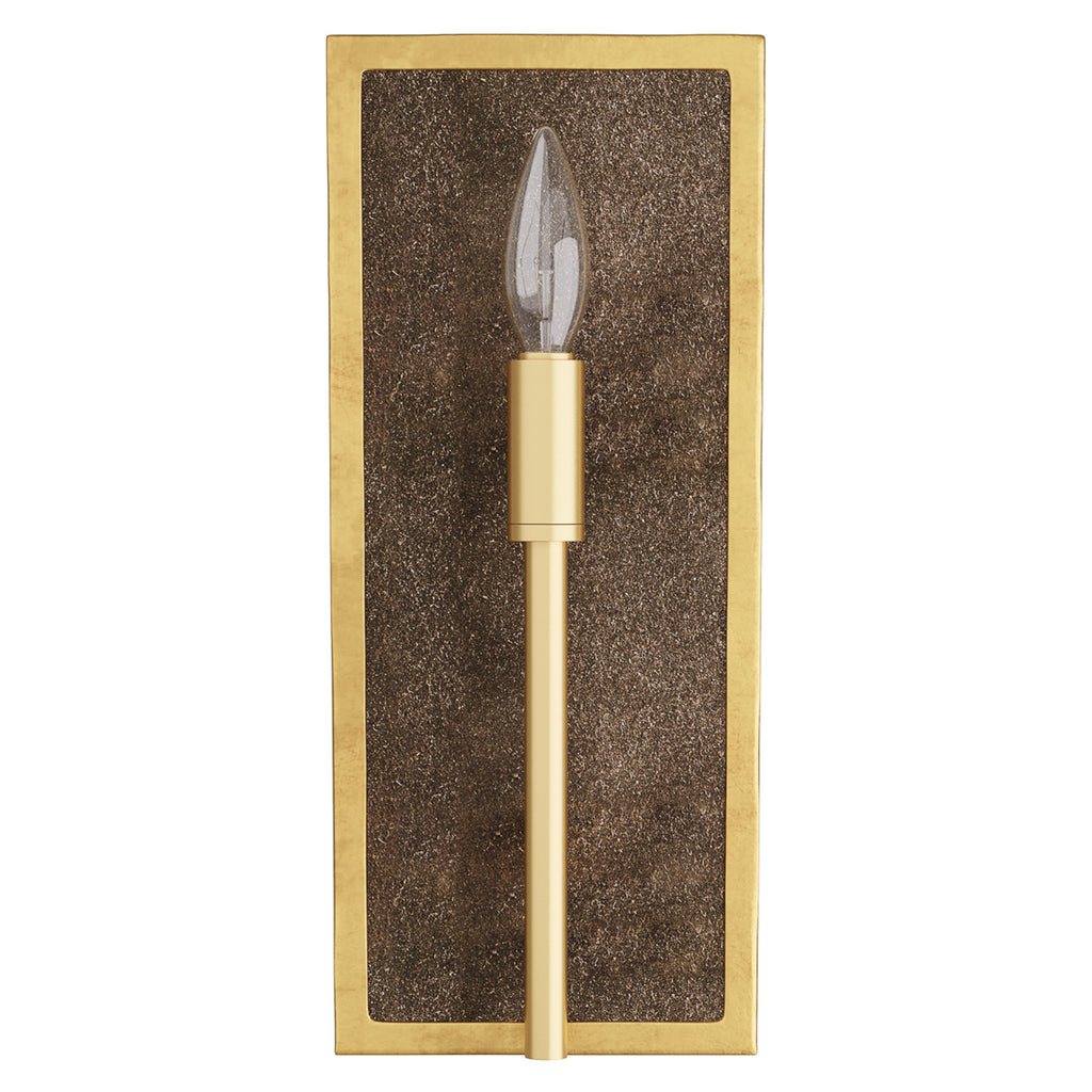 This transitional sconce pairs a textural brown suede backplate with an antique brass finished iron support and frame to intrigue the eye. Designed to perfectly highlight an elegant edison bulb, accented with a scoreline finish below the bulb. Damp-rated, although limited covered outdoor conditions may affect finish. Finish will vary.