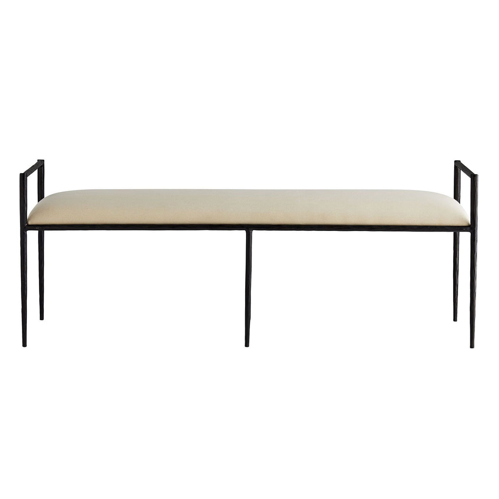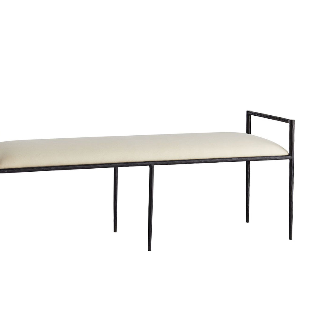 The Arteriors Barbana Bench raises the bar for stylish seating options. Its frame is perfectly poised, perched on delicate legs as faint as an insect's. The natural iron body is hand forged, yielding soft impressions along the sharp-angled frame. The tight seat is covered in muslin, allowing you to cover in the fabric of your choice.
