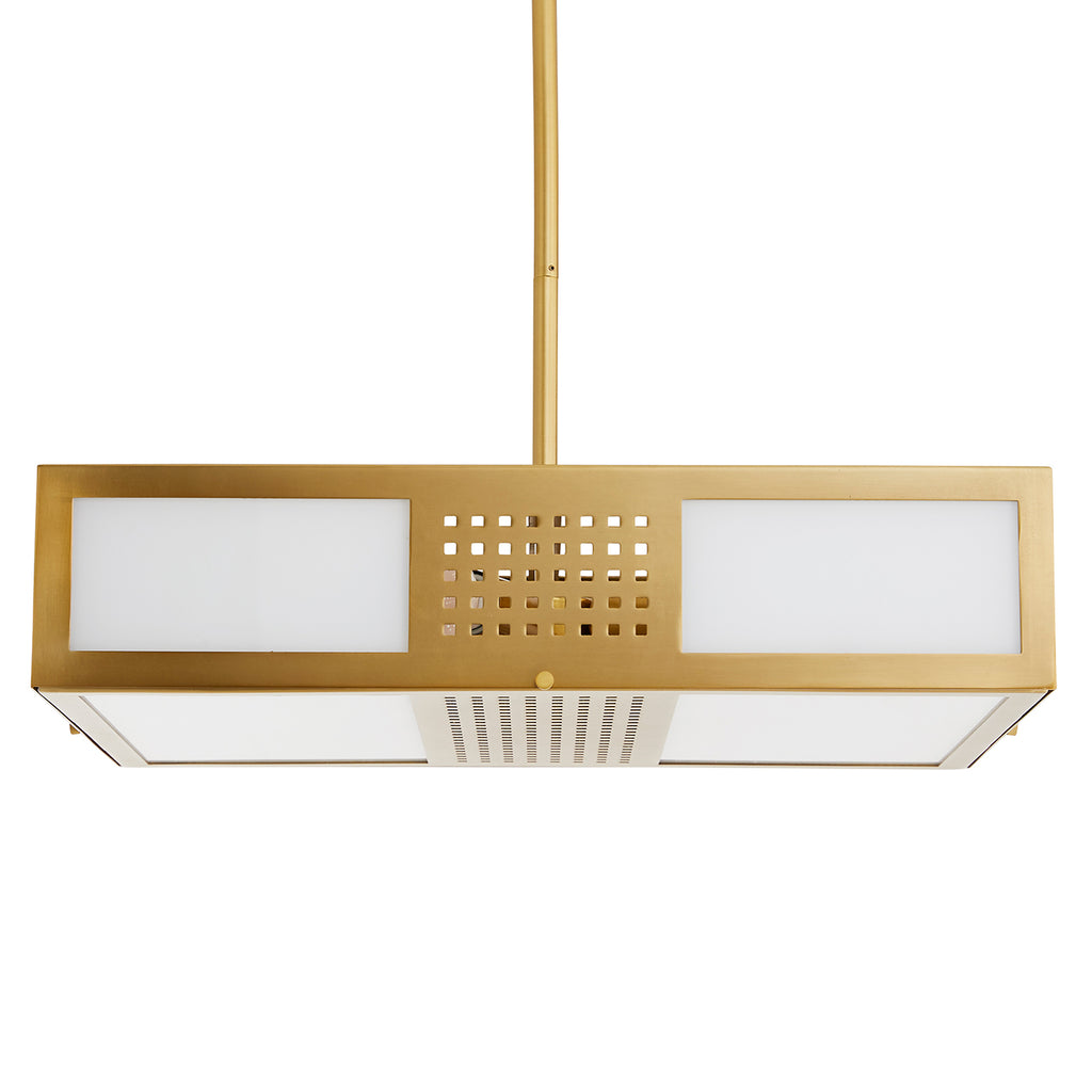 Arteriors Home lighting embodies the perfect balance of form and function, creating an ambiance that is both captivating and inviting. From sleek and minimalist lighting to more ornate and intricate fixtures, the Arteriors Home pendants offer something for every taste and style. Clean lines, crafted from stainless steel, frame plates of frosted glass, so the light beneath is filtered beautifully the mid-strip is hand-punched and casts scattered light in every direction. The bottom plates are removable for easy bulb replacement. The brass tones are a brushed,antique finish that runs all the way up the flush mount. Damp rated, limited covered outdoor conditions may affect finish.