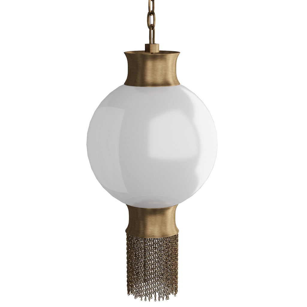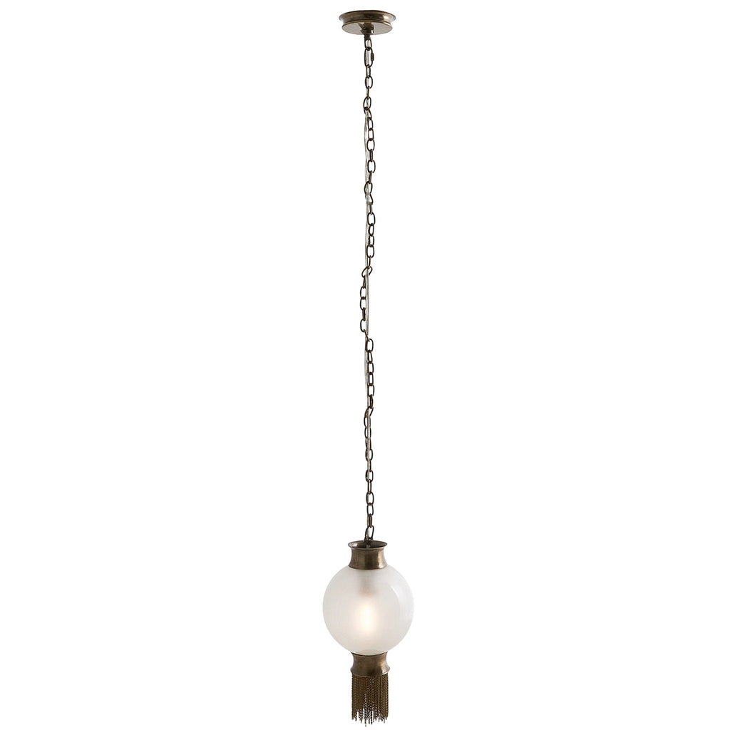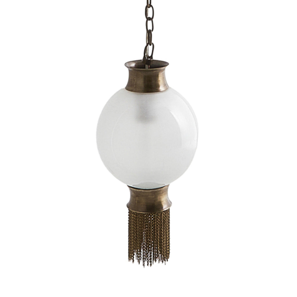 Art deco lines are updated for a modern era result in this chic pendant lamp. Finished with a flourish of antique brass jewelry chain fringe, a frosted glass globe is suspended from a substantial iron chain finished in antiqued brass. Damp-rated, although limited covered outdoor conditions may affect finish. Finish will vary.