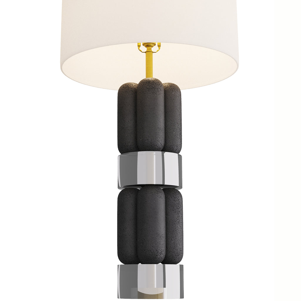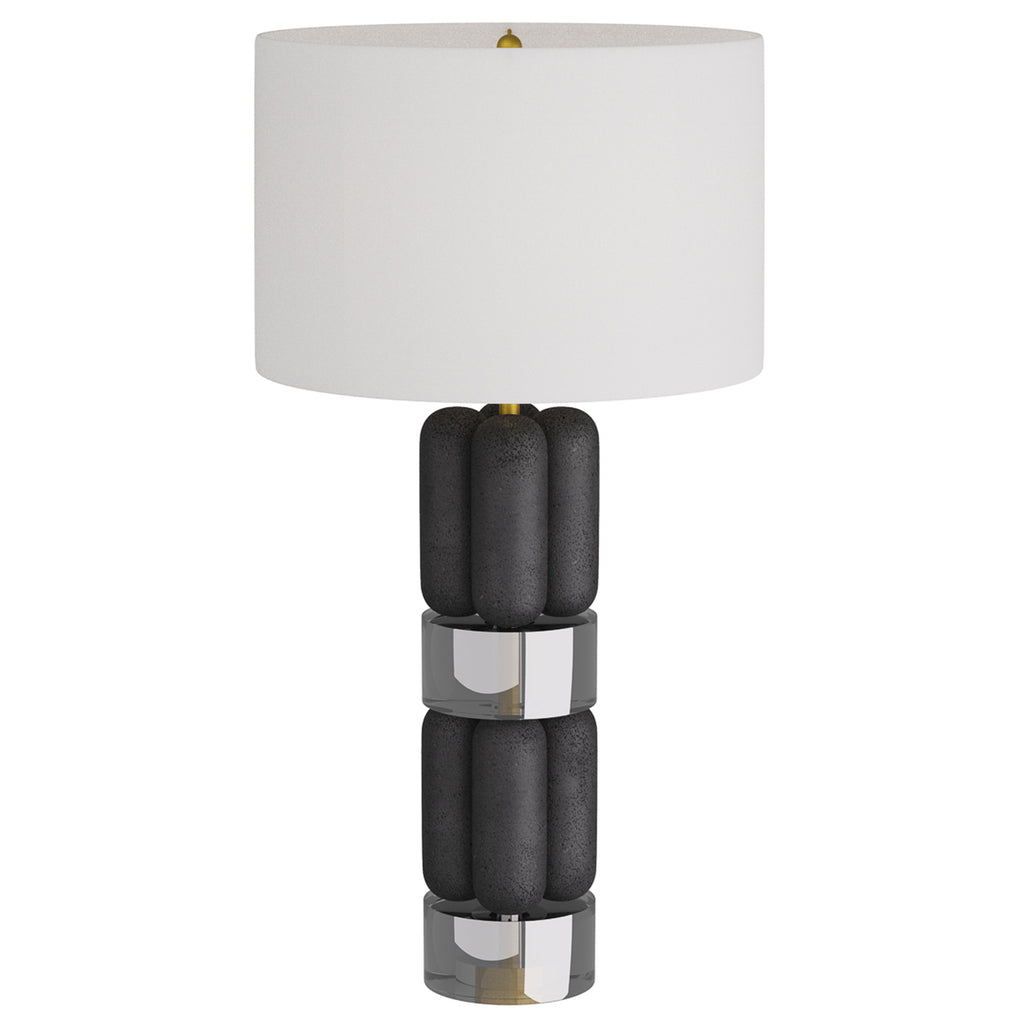 A play of opaque and translucent materials elevates this pillar lamp. Juxtaposing tiers of charcoal ricestone composite with smoked crystal and an eye-catching mirrored effect, its totemic shape culminates in a drum shade of white linen. Accented with antique brass hardware and a black cloth cord. Three-way rotary switch. Finish will vary.