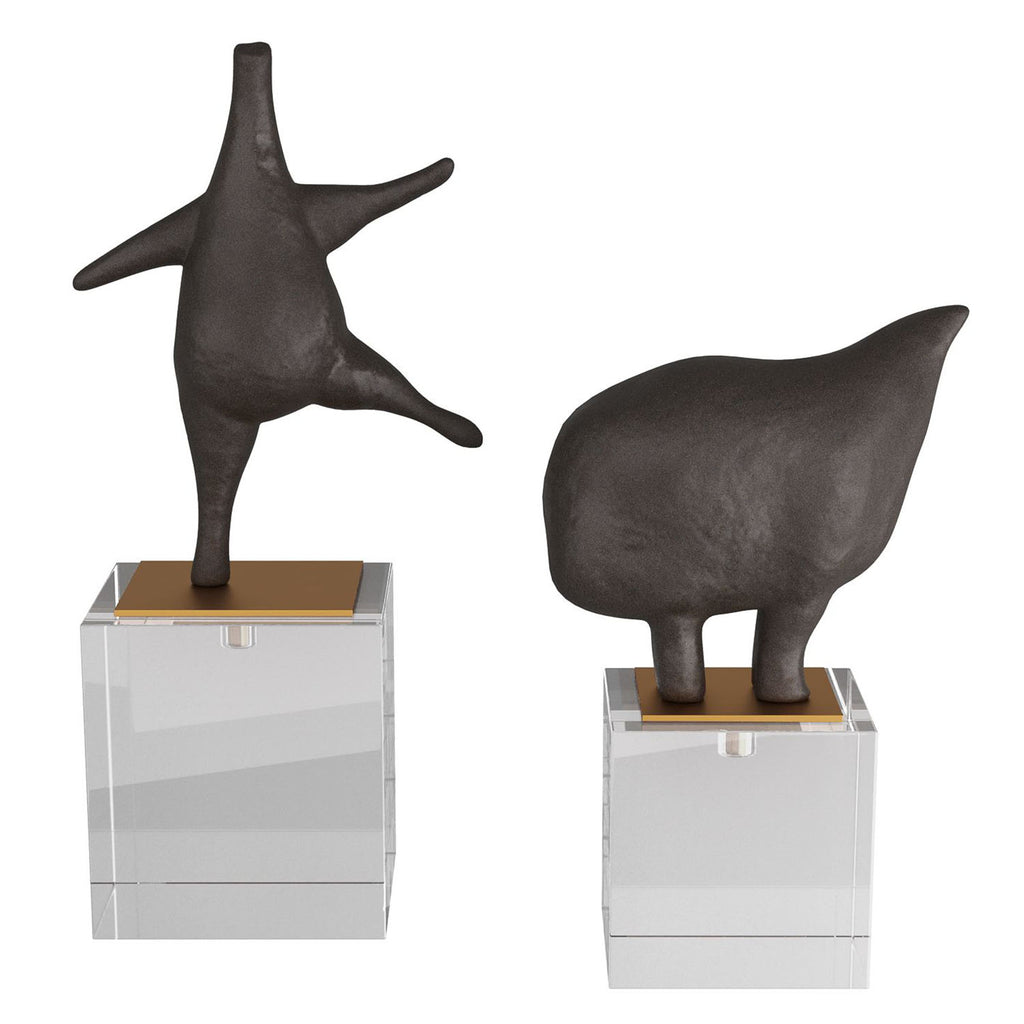 Abstract animals frolic atop bases of antique brass steel mounted on clear crystal cubes. Skillfully carved of black riverstone, this modernist duo adds a touch of whimsy to any space. Finish will vary.
