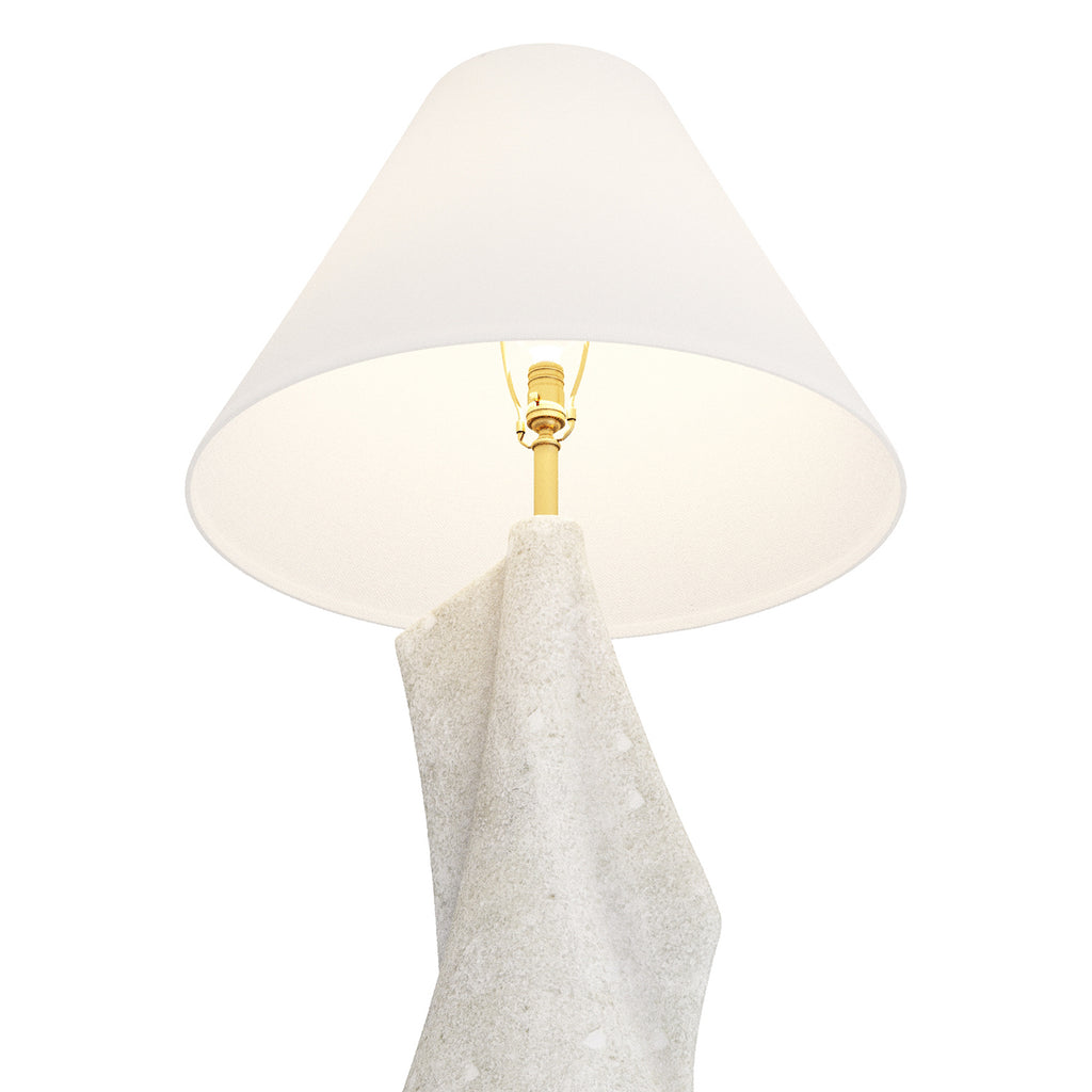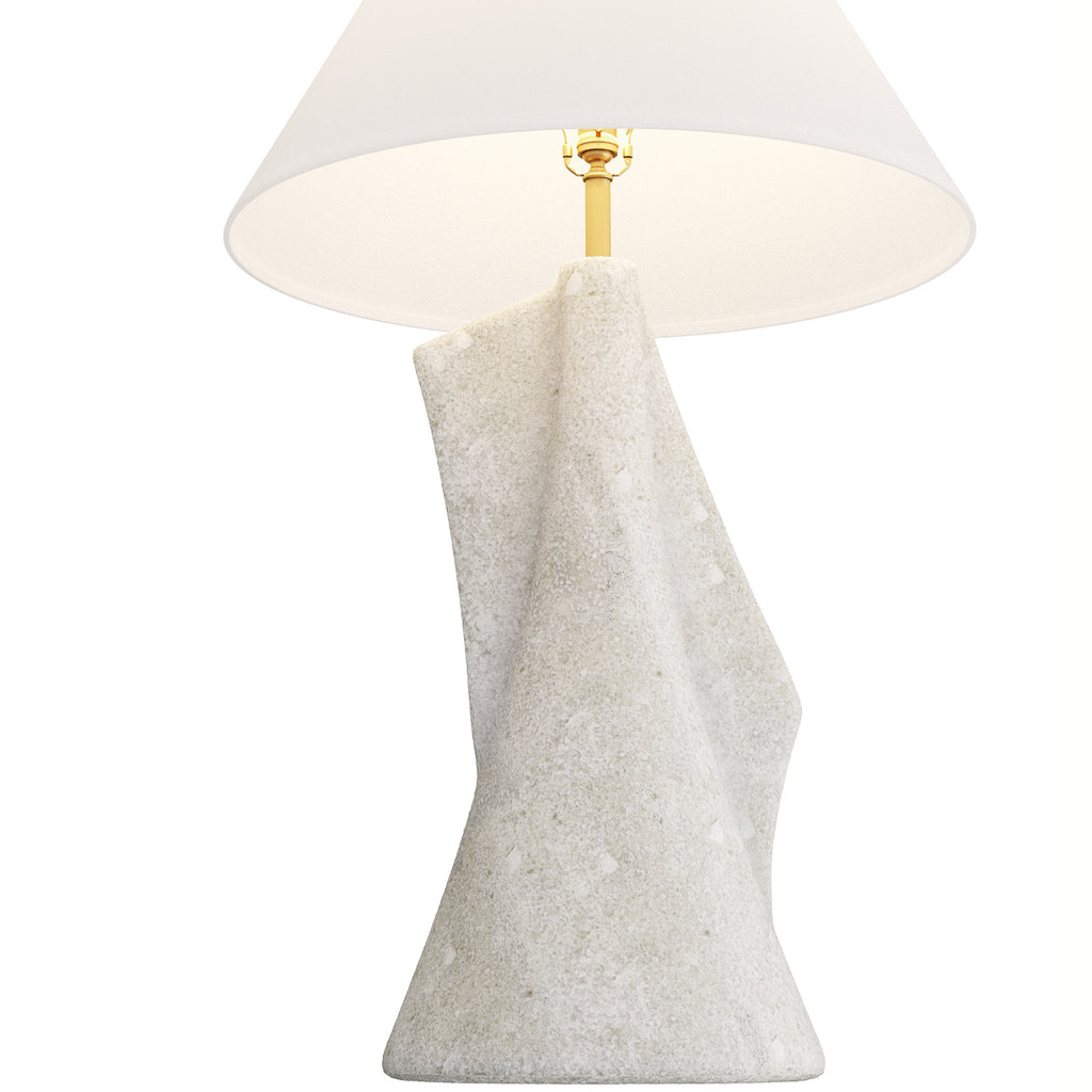 An organic base of ivory glass stone composite is a piece of modernist sculpture for your desktop. The Arteriors Bruce’s free-flowing form is finished on either side with irregular “fins” to intrigue the eye. Accented with a support and finial sphere finished in antique brass, it is topped with a shade of ivory cotton and finished with a taupe cord. Three-way rotary switch. Finish will vary.