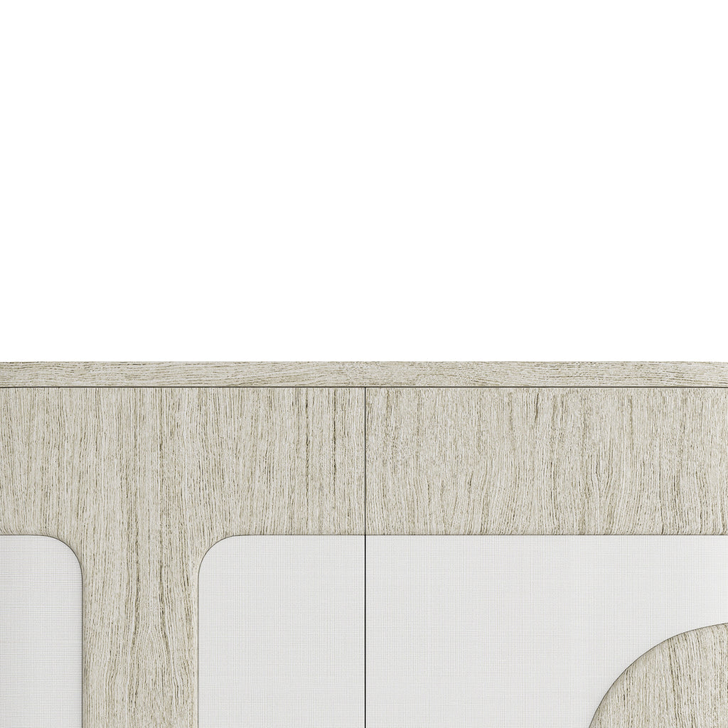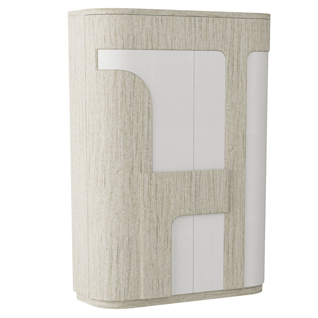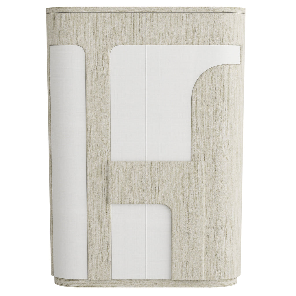 Mixing the textures of wood and grass cloth, our Arteriors Brusa Cabinet draws from the best of the bauhaus movement. Its simple, flowing façade pairs beige seagrass cloth accents with heavy beige oak veneer panels. Brutalist in influence and practical in function, this textural design features three interior shelves and a bronze iron base. Finish will vary.