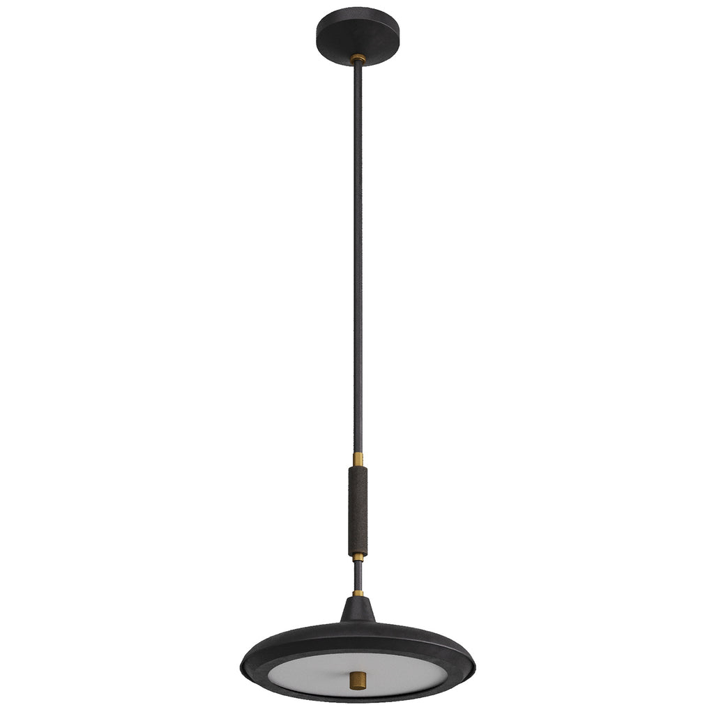 Crafted with an industrial aesthetic, this sleek flat shade in english bronze steel, is matched with a frosted acrylic diffuser, concealing an integrated led. Accented with a structure in antique brass steel with etched antique brass details and finial. Damp-rated, although limited covered outdoor conditions may affect finish.