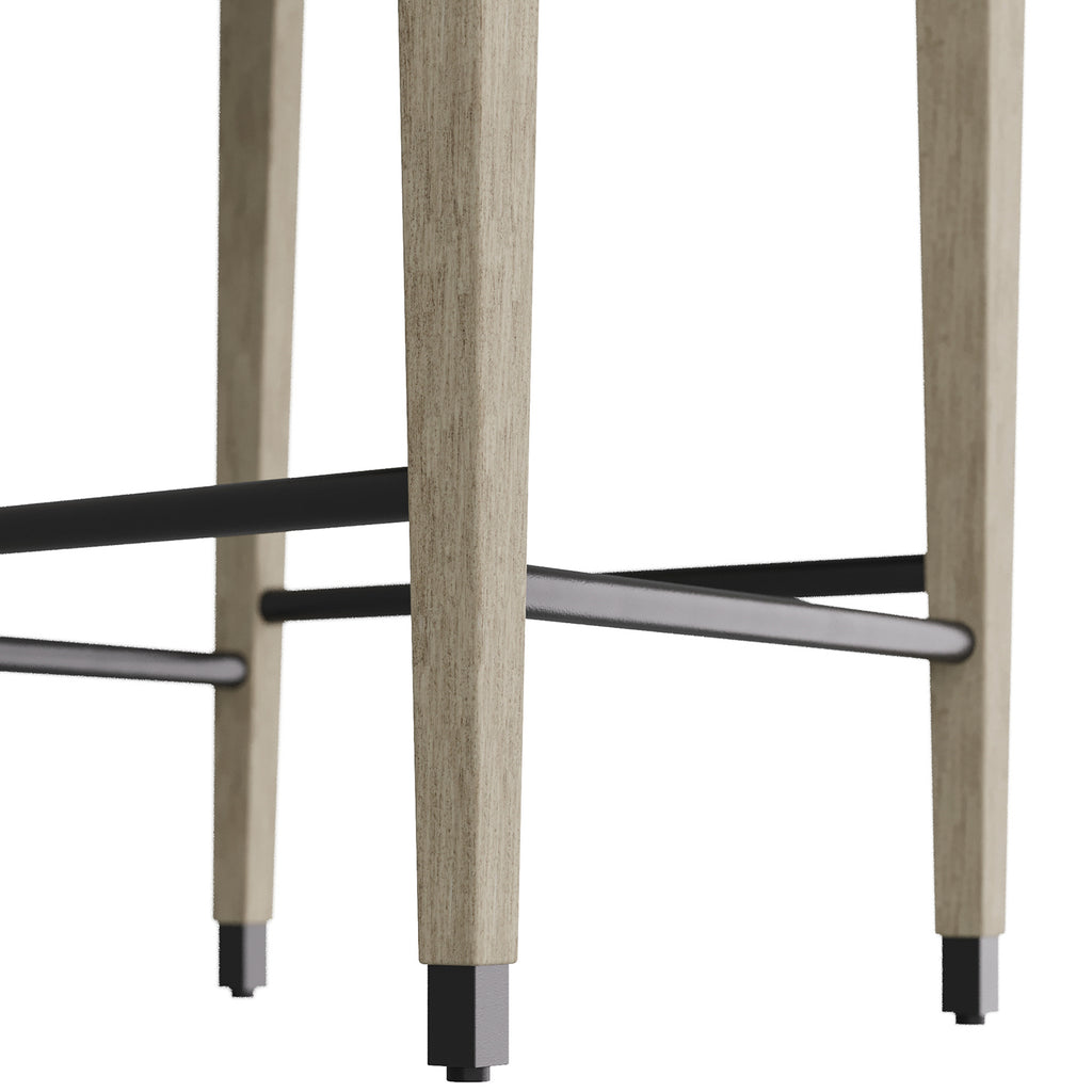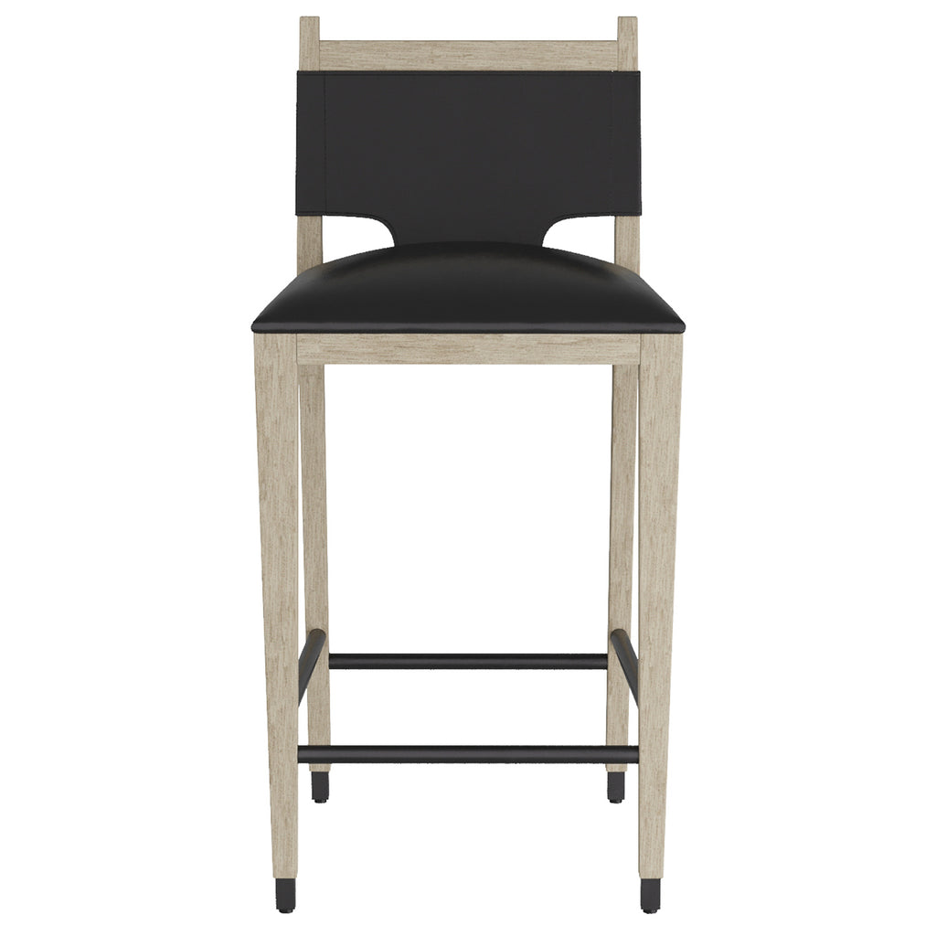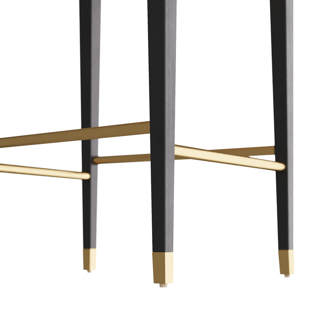Tapered legs and straight lines lend a masculine appeal to our tailored ebony finished beech wood bar stool. For comfort and style, we wrapped the t-shaped and well-padded seat in leather. Finished with non-functional snap details and tipped at each leg with antique brass sabots. Leather will vary.