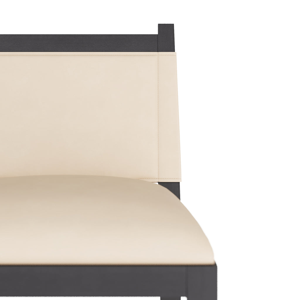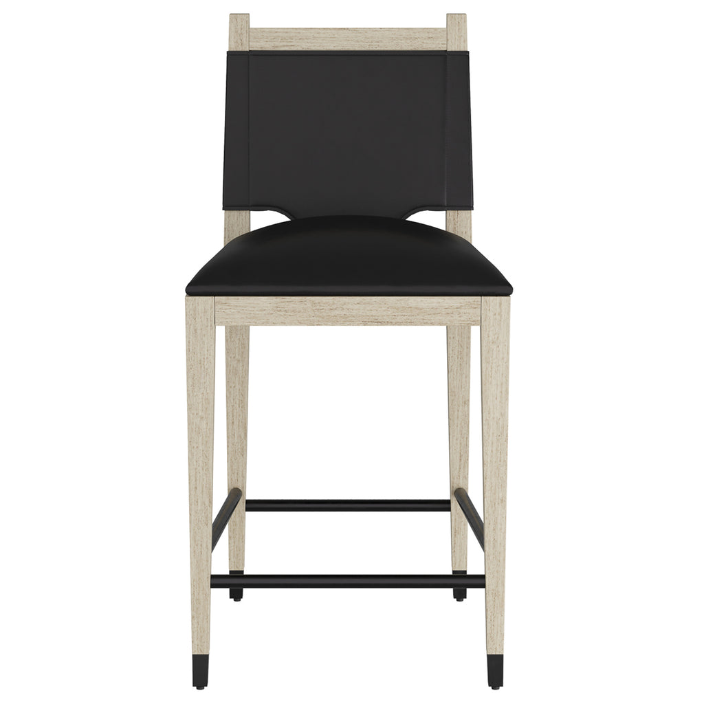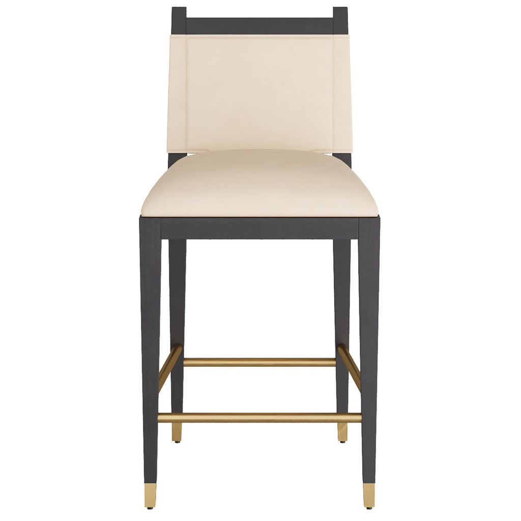 Tapered legs and straight lines lend a masculine appeal to our tailored ebony finished beech wood counter stool. For comfort and style, we wrapped the t-shaped and well-padded seat in leather. Finished with non-functional snap details and tipped at each leg with antique brass sabots. Leather will vary.