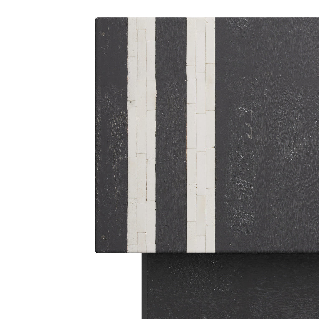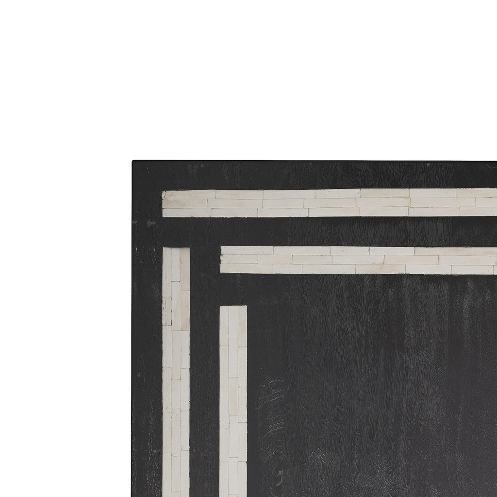 Graphic stripes of inlaid ivory bone intersect a cube of ebony-finished mango wood. A fresh twist on the classic cube table, this monolithic form balances over a recessed base for visual interest. Finsh will vary.