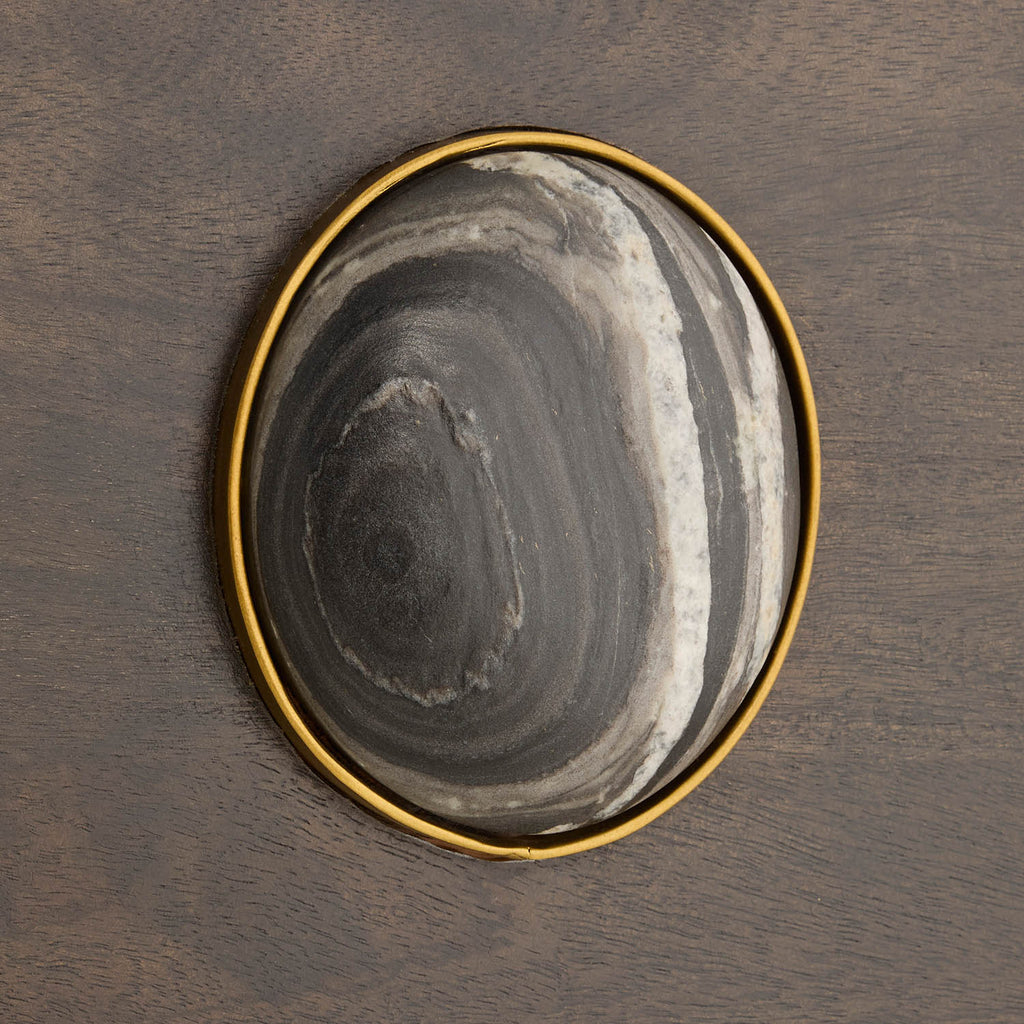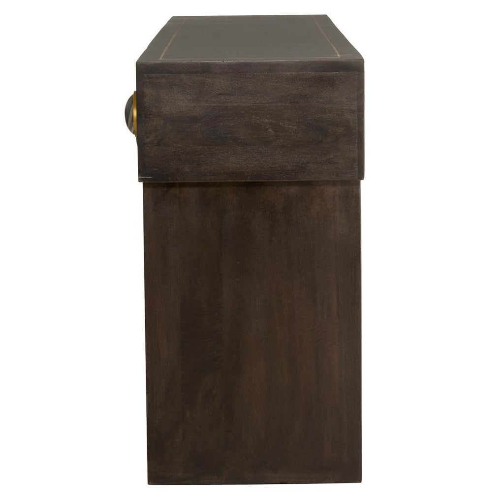 Our substantial wood console of umber mango wood is full of artisan details that showcase the designer's craft and consideration. Inlaid antique brass fittings and linework enhance the clean lines, while inset cabochons of bengal marble recall handmade jewelry. Finish will vary.
