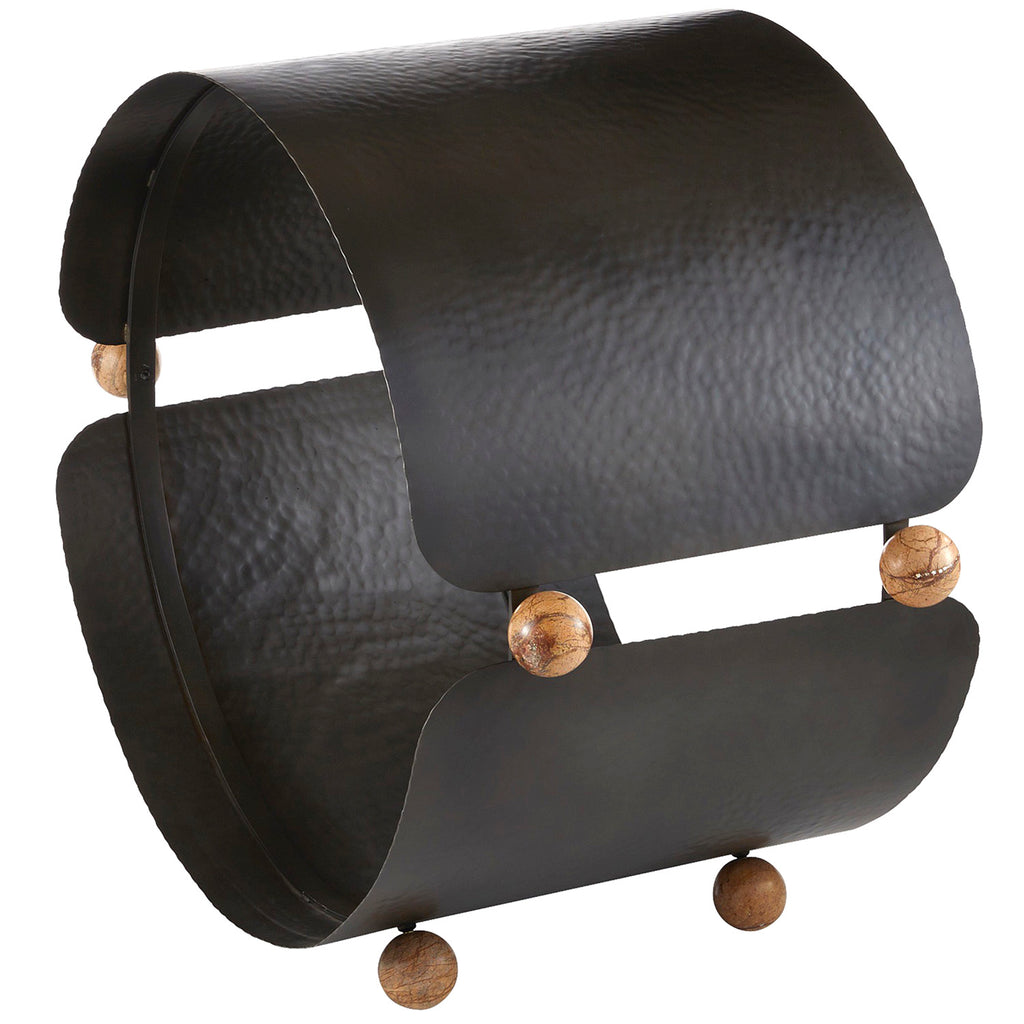 A traditional log holder is updated in hammered, blackened iron. Its oversized circular profile acts as enclosed storage, while contrasting spacers of sienna marble add an element of surprise. Finished with marble feet, its modernist silhouette is a work of functional art for any hearth. Finish will vary.