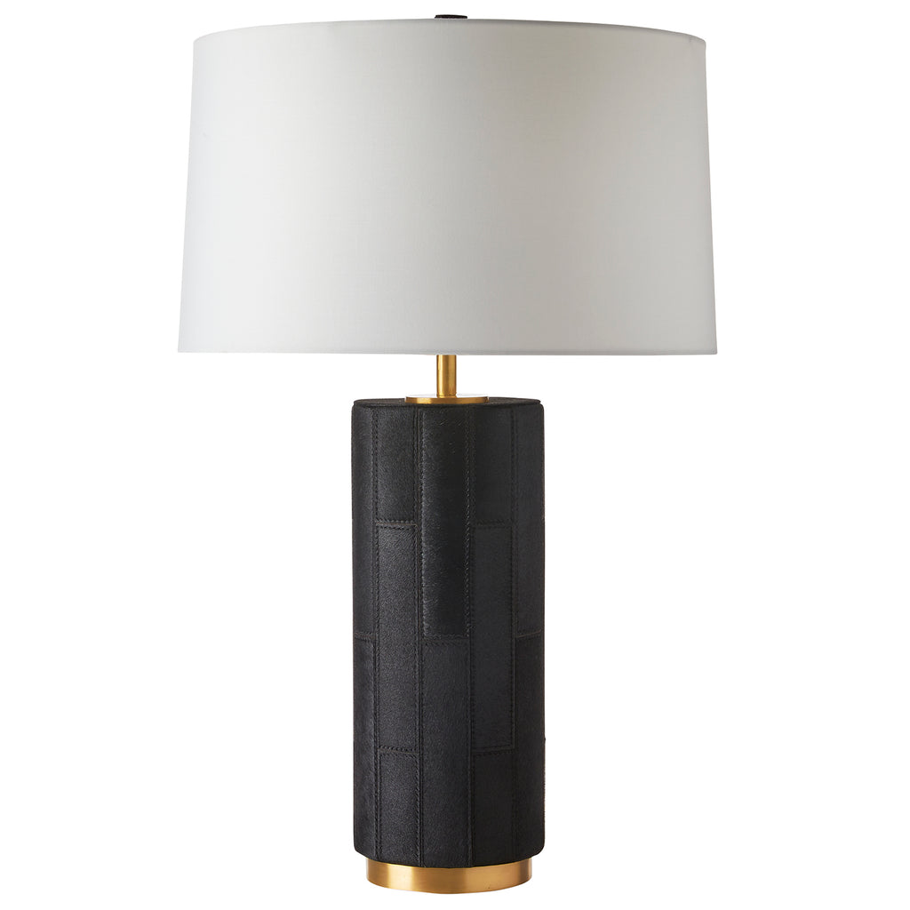 Delivering a luxe, hollywood regency mood, the simplistic silhouette of the Arteriors Cartwright Table Lamp is elevated through intricately patchworked black hair-on-hide. the topstitched black column balances on an inset base of antique brass. matching hide finial and off-white cotton drum shade. finish will vary.