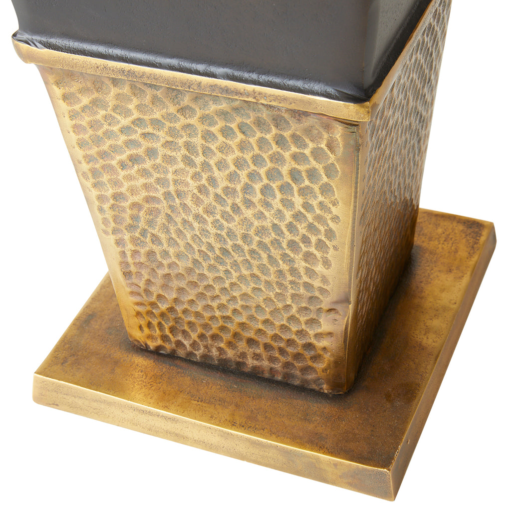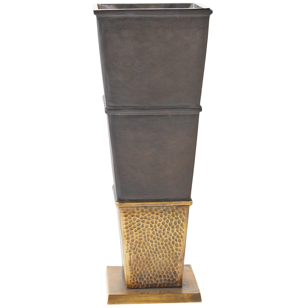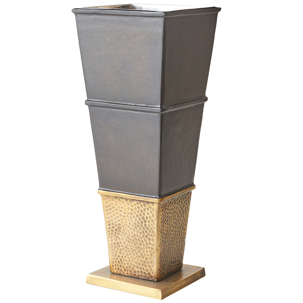 Inspired by the entryways of ancient ceremonial buildings, our impactful aluminum planter pairs bronze and antique brass finishes. Possessing bold geometric lines, it is adorned with gauging details around the bottom band. Includes a polished nickel stainless steel liner with a drainage hole. Finish will vary.