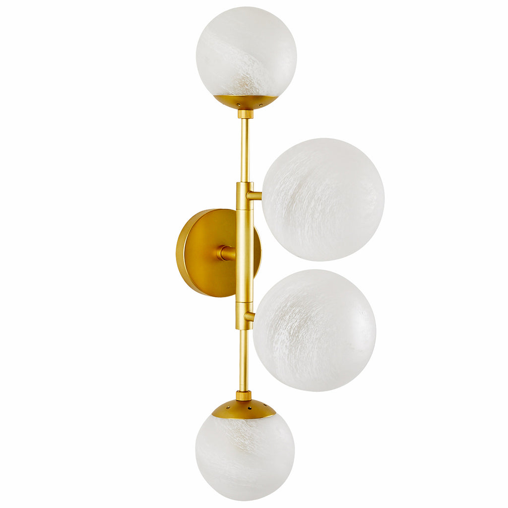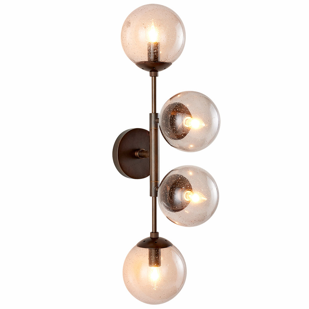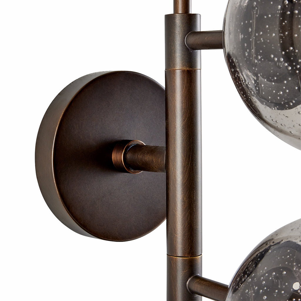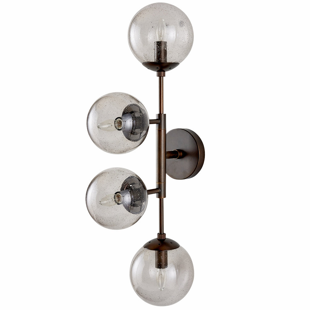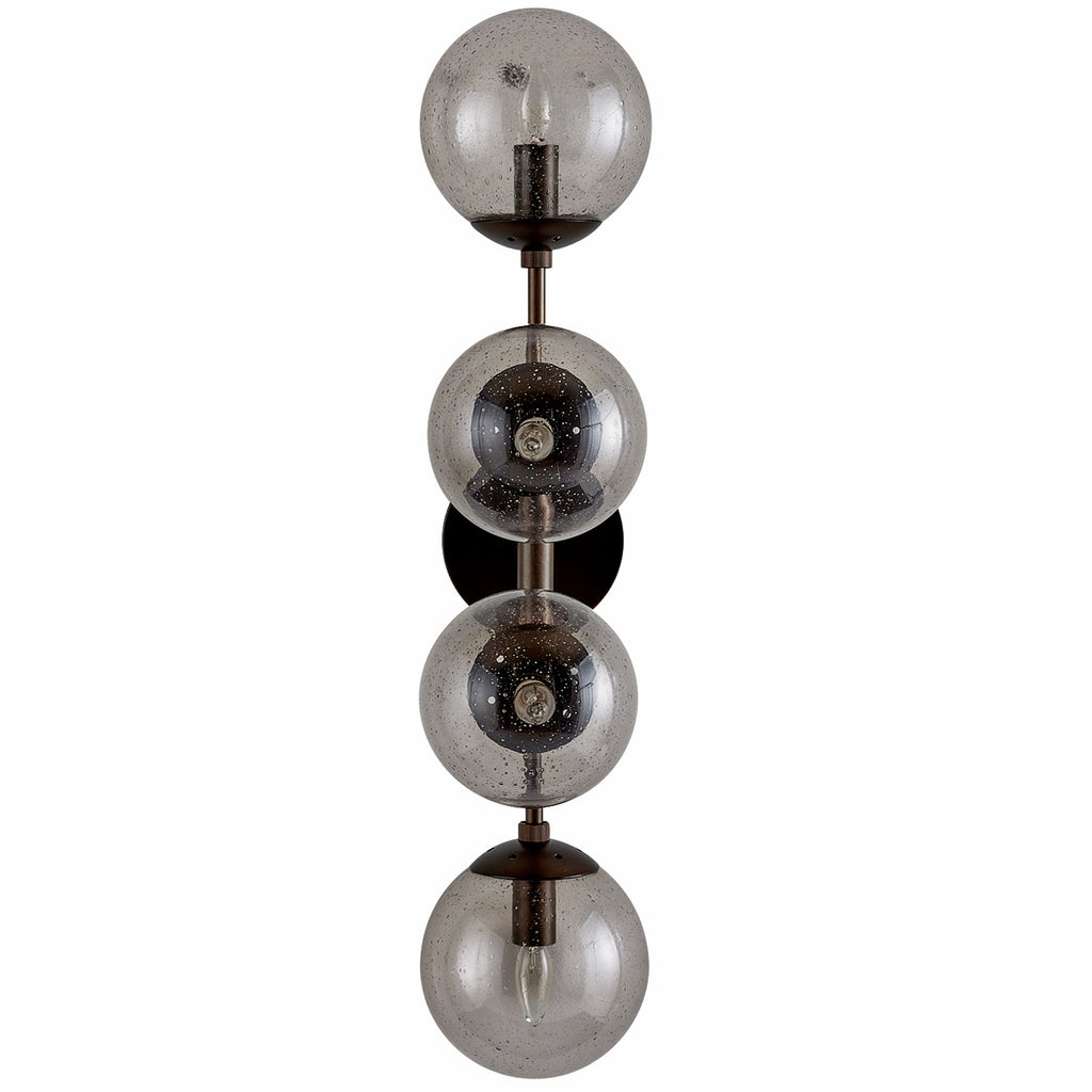 Like celestial bodies, a quartet of smoke seedy glass globes orbit an axis of english bronze-plated steel. Articulated arms allow Arteriors Christelle Wall Sconce to easily rotate, allowing for a striking mirrored effect. Hang this impactful style horizontally or vertically, alone or in multiples. Finish will vary.