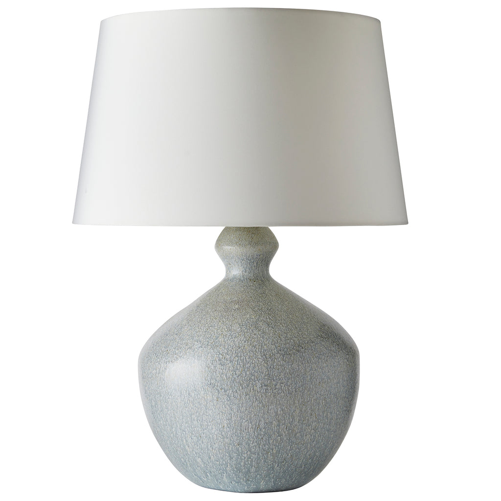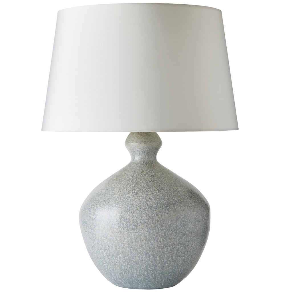 With an exaggerated base and minimized top, the Arteriors Clementine Table Lamp is a refresh of the classic gourd lamp. The sinuous lines of this ceramic essential are glazed in a soothing, icy morn hue. Finished with a matching ceramic finial, off-white microfiber drum shade, and antique brass hardware. Clear silver cord. Finish will vary.