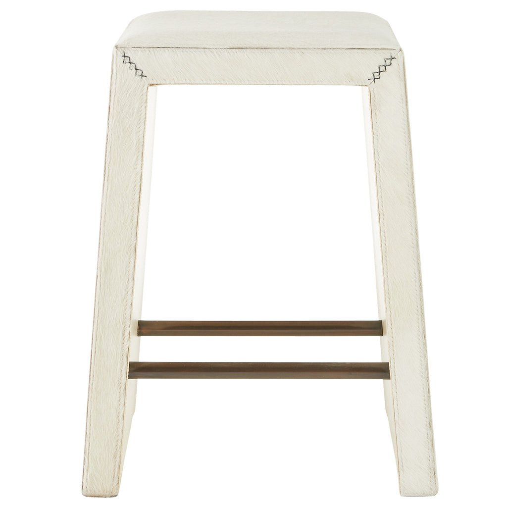 Crafted of white hair-on-hide, this backless counter stool is a tactile delight. A mitered whipstitch creates a racing stripe down the center of each side, while slim antique brass bridges add contrast and support to this minimal design. Hide will vary.