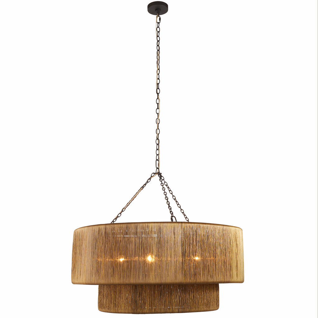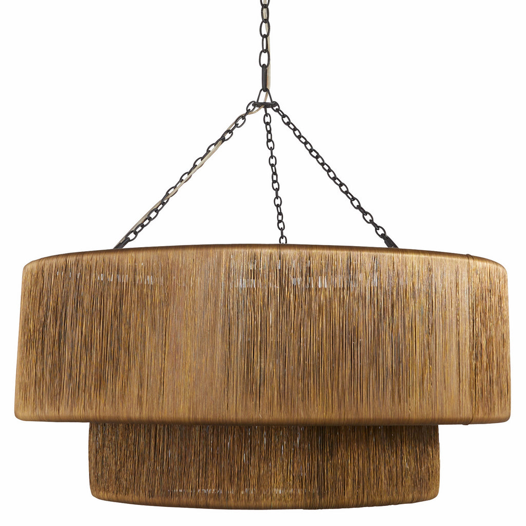 A waterfall of wrapped vintage brass wire adds a luxurious accent to a traditional tiered drum shade. Suspended from blackened iron chains, this handmade fixture hides three clear bulbs that deliver a glimmering, always flattering illumination. Finish will vary.