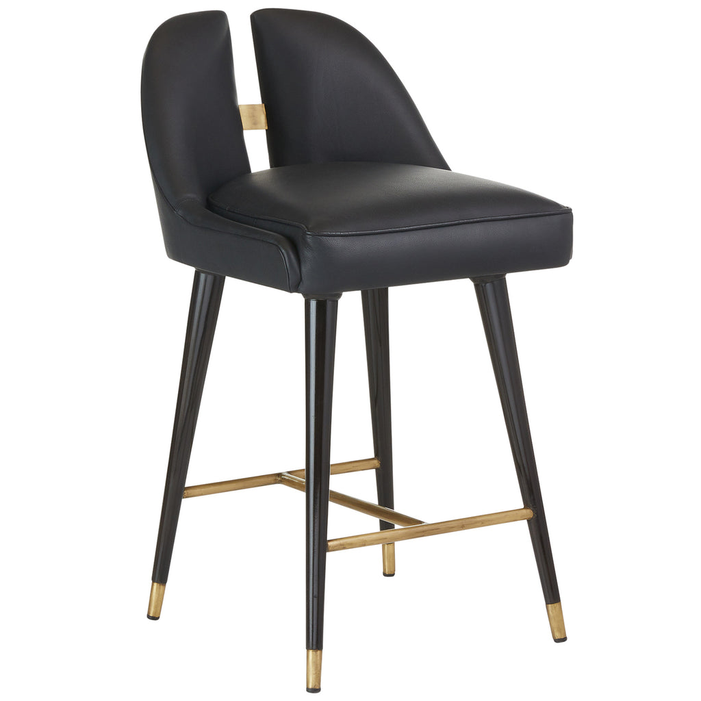 The ideal balance of masculine and feminine, a sleek slit detail mimics an alluring open-backed dress. Upholstered in soft black leather, this counter stool is enhanced with polished antique brass joinery. Poised on slim, ebony beech wood legs tipped in brass. Leather will vary.