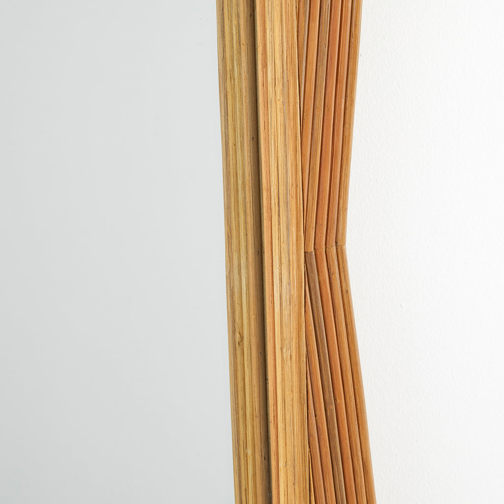 Wrapped in natural rattan, this geometric style brings an organic texture to any room. Inspired by the modern forms found in mid-century architecture, the decorative frame surrounds a simple rectangular mirror. Designed to be hung vertically or horizontally, it is secured with a hanging cleat at the back. Rattan will vary.
