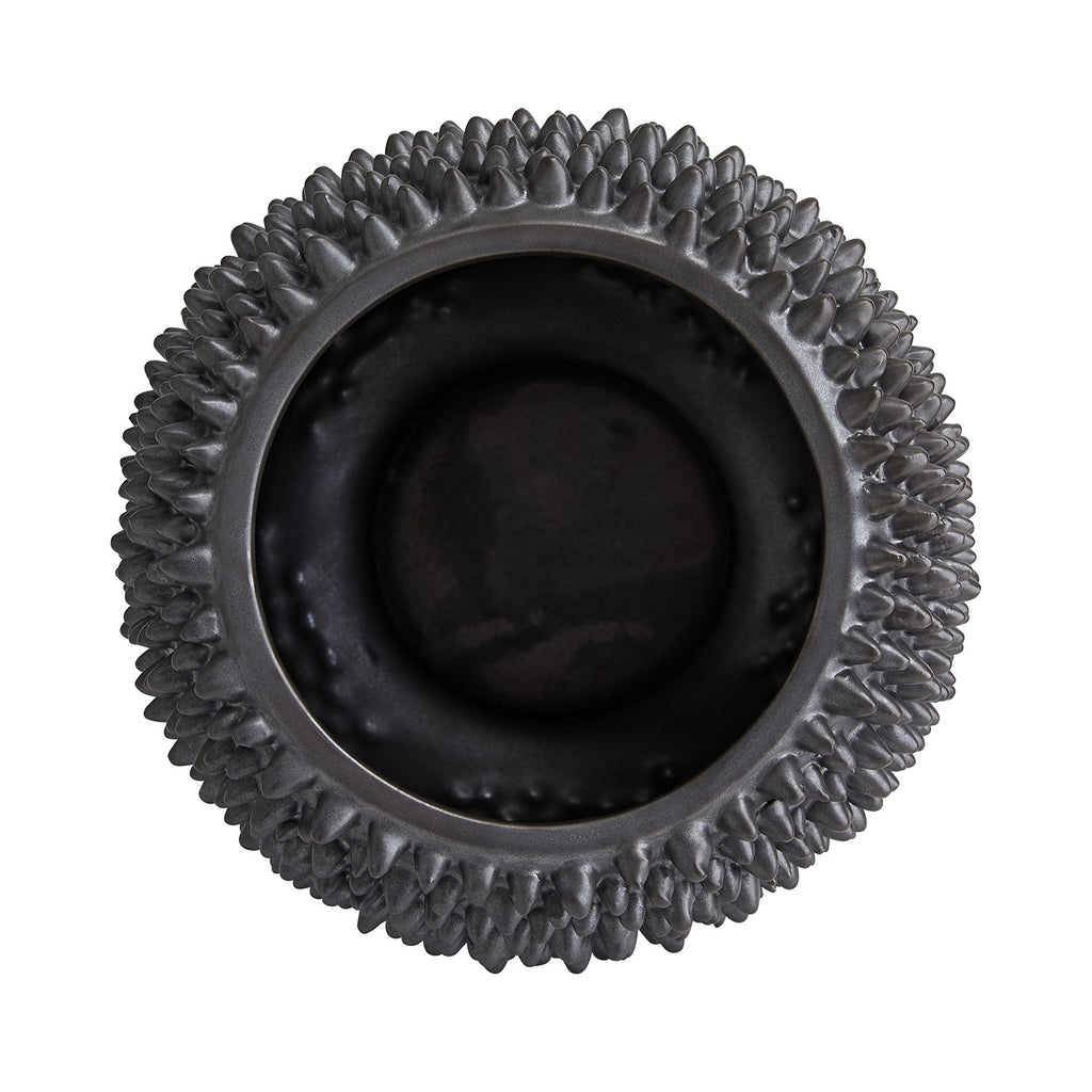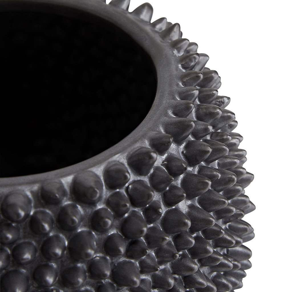 Sporting a heavily textured facade reminiscent of jackfruit with tiny spikes, this matte black ceramic vase mounted on a matte black base draws attention. Watertight and suitable for covered outdoor use—finish will vary.