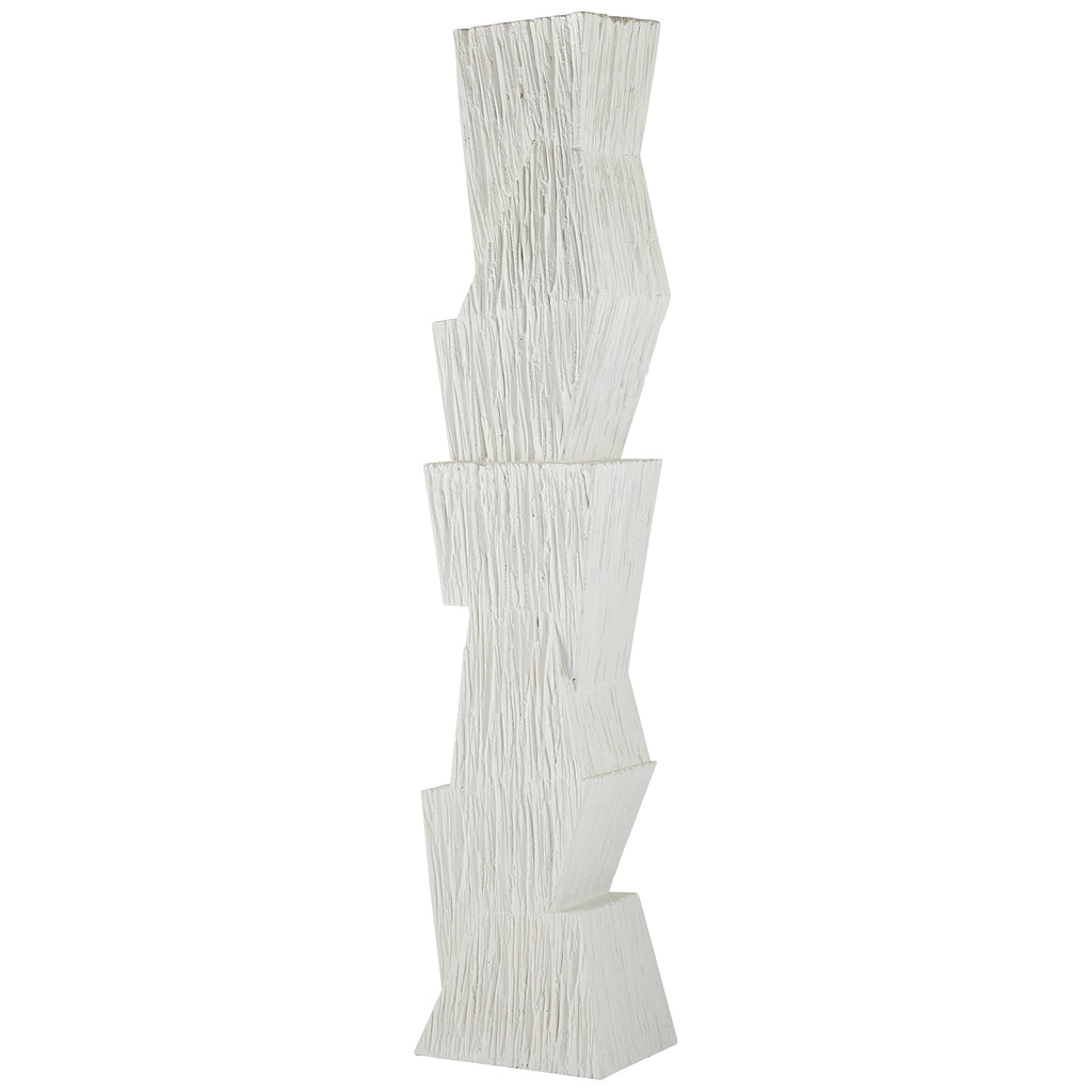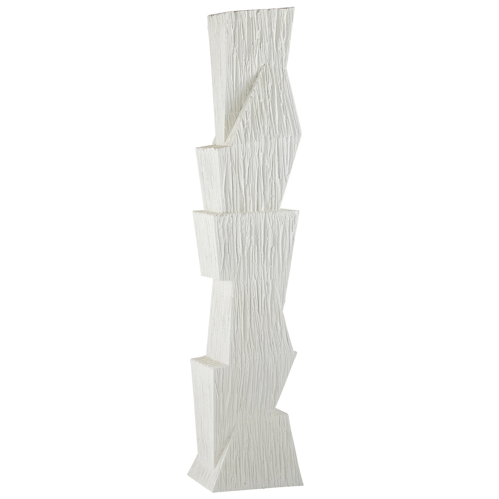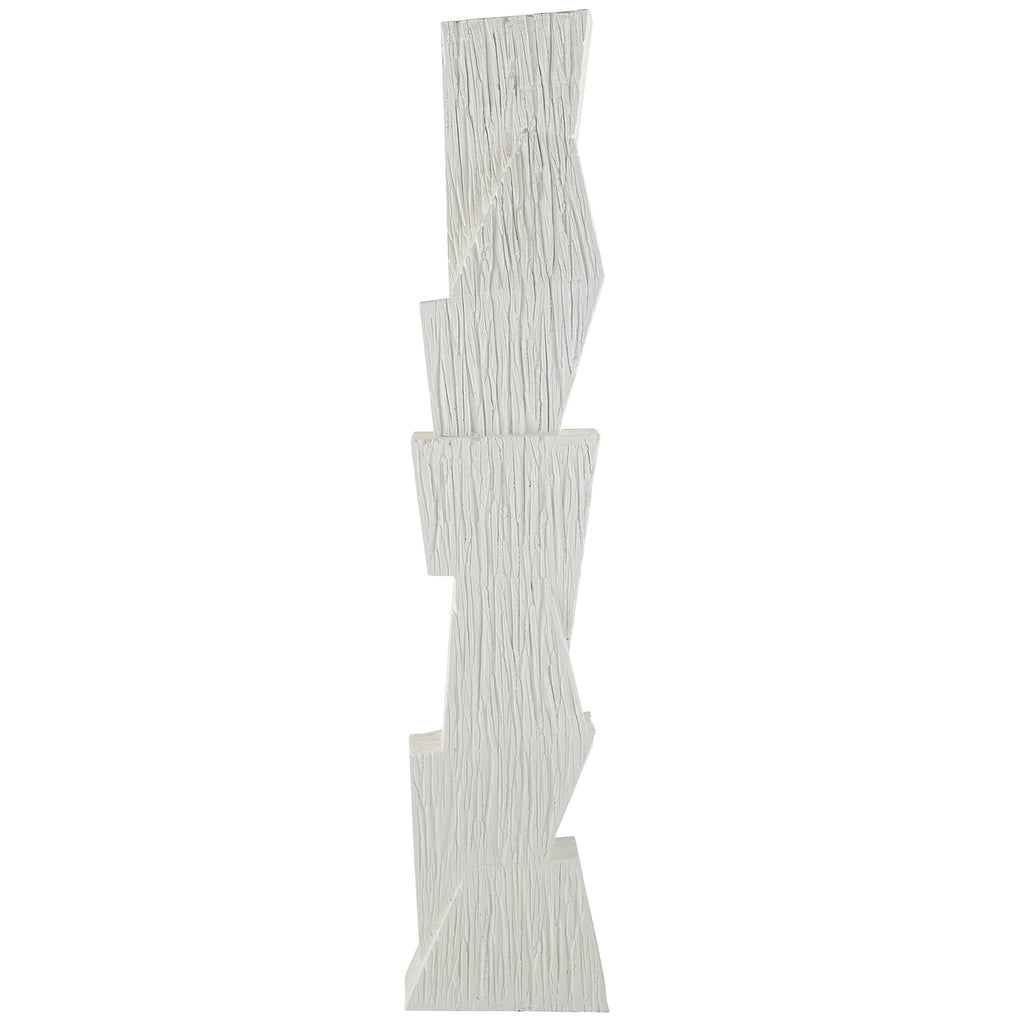 A totem of matte white resin is a commanding accent piece for any corner of the room. Designed to draw the eye to its geometric form, a faux wood finish adds a dynamic accent to the texture on its vertical surface. Finish will vary.