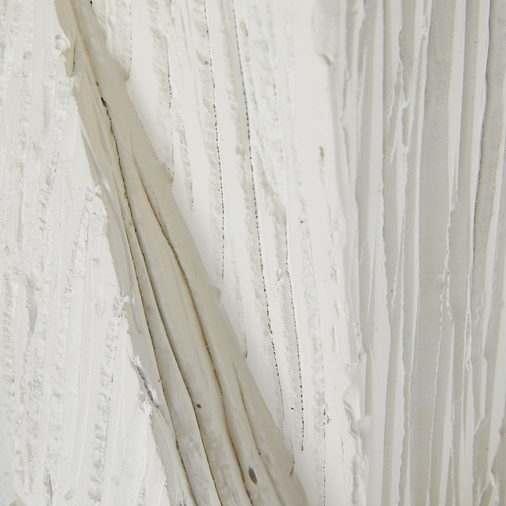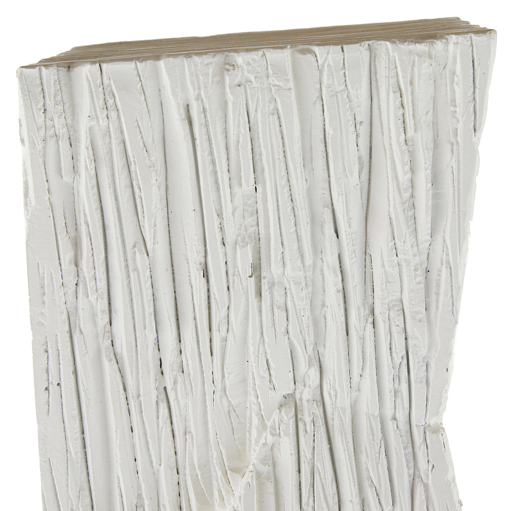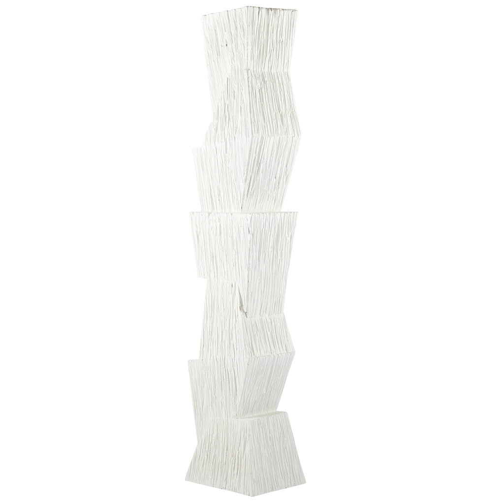 A totem of matte white resin is a commanding accent piece for any corner of the room. Designed to draw the eye to its geometric form, a faux wood finish adds a dynamic accent to the texture on its vertical surface. Finish will vary.