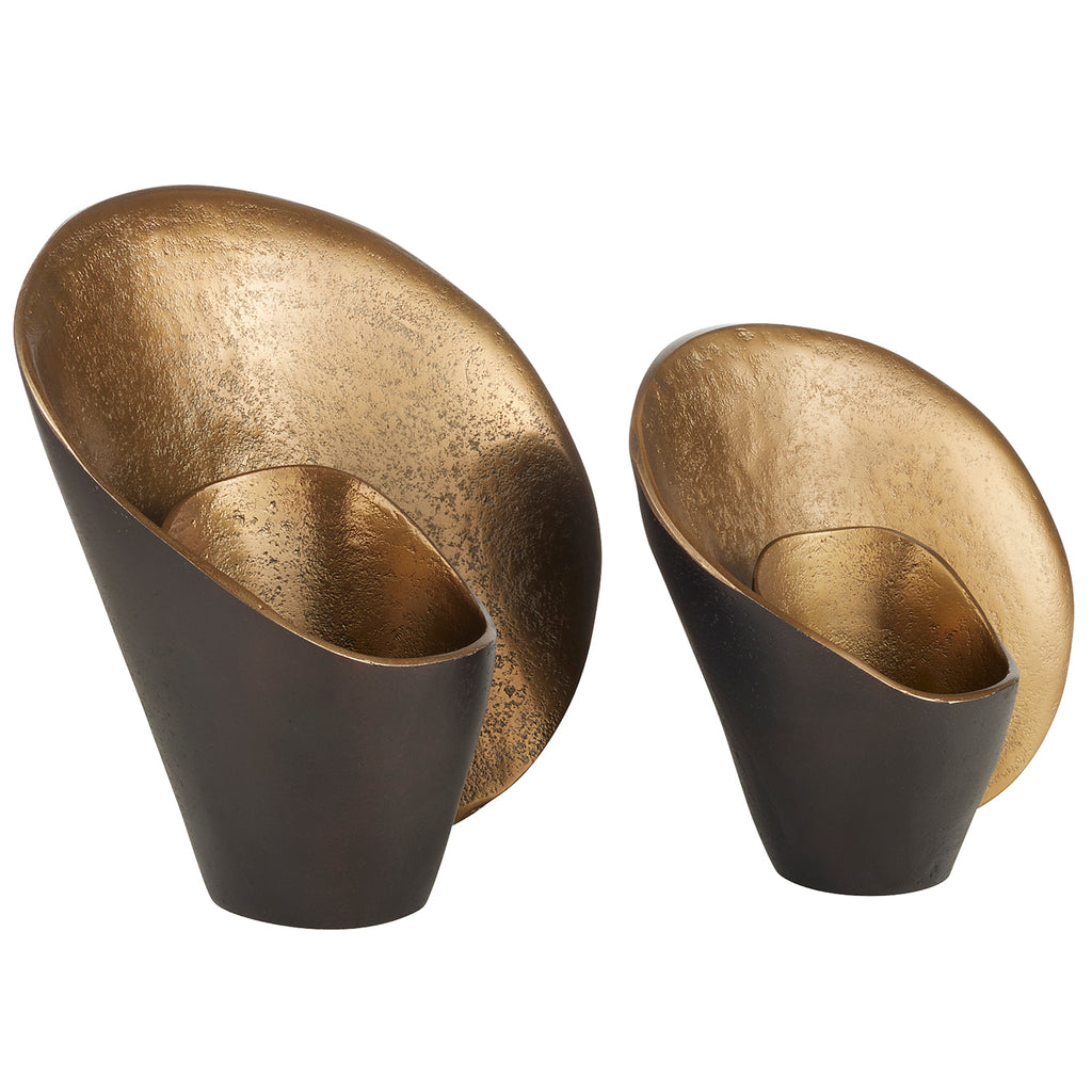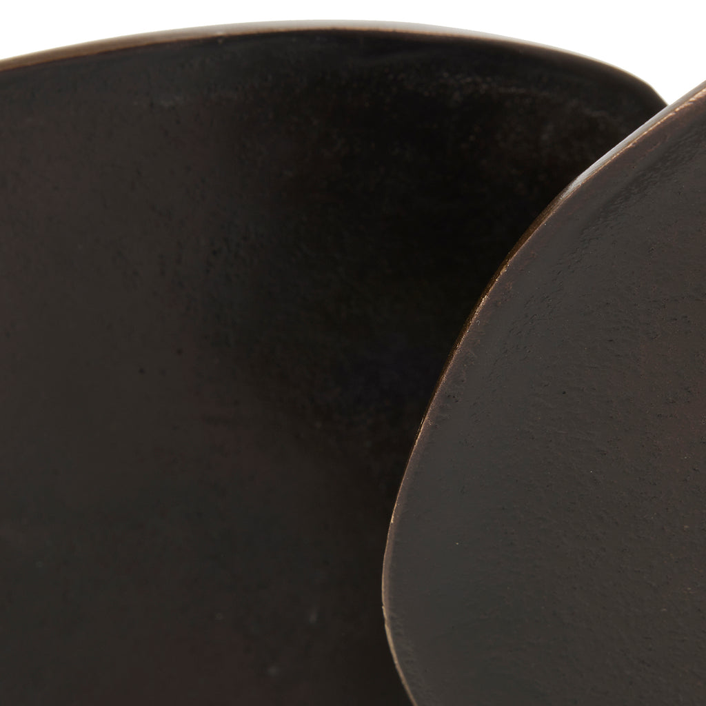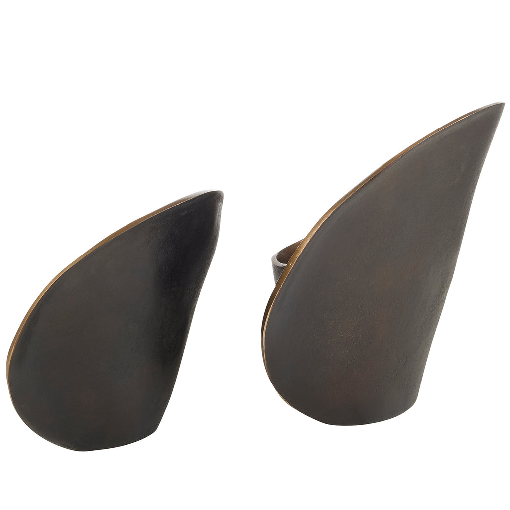 Playful spirals of antique brass intrigue the eye. These striking sculptures have an abstract appeal, enhanced by bronze finishing along the outside of their curvaceous silhouettes. Finish will vary.