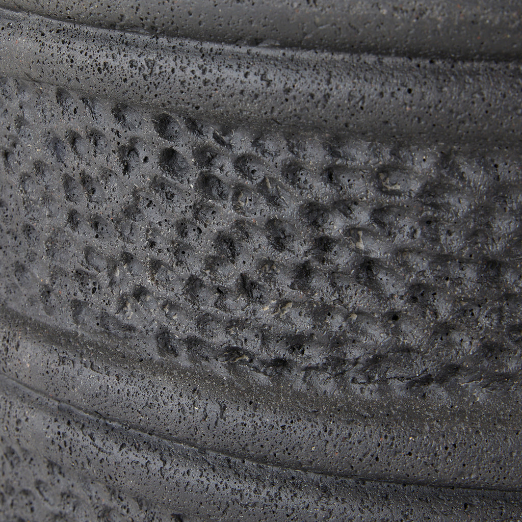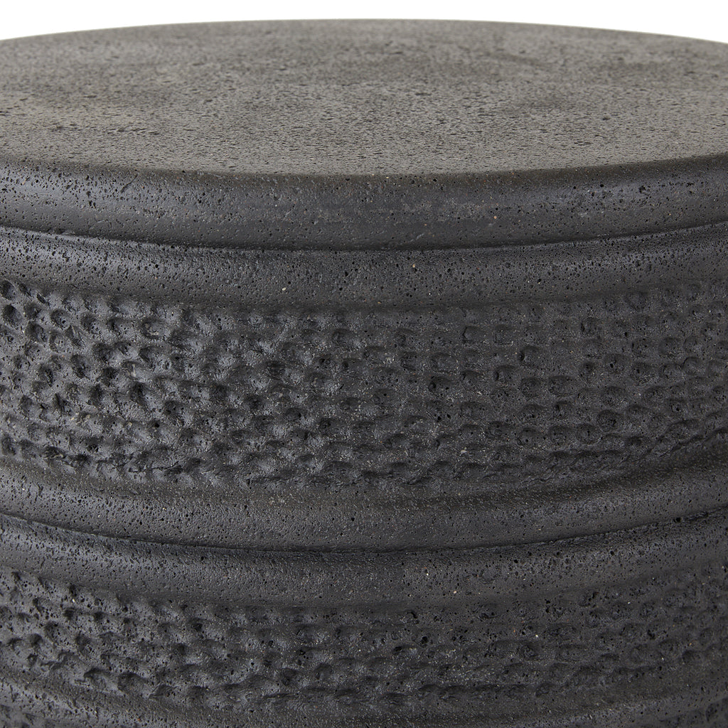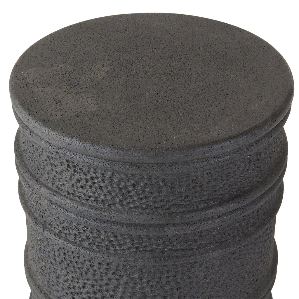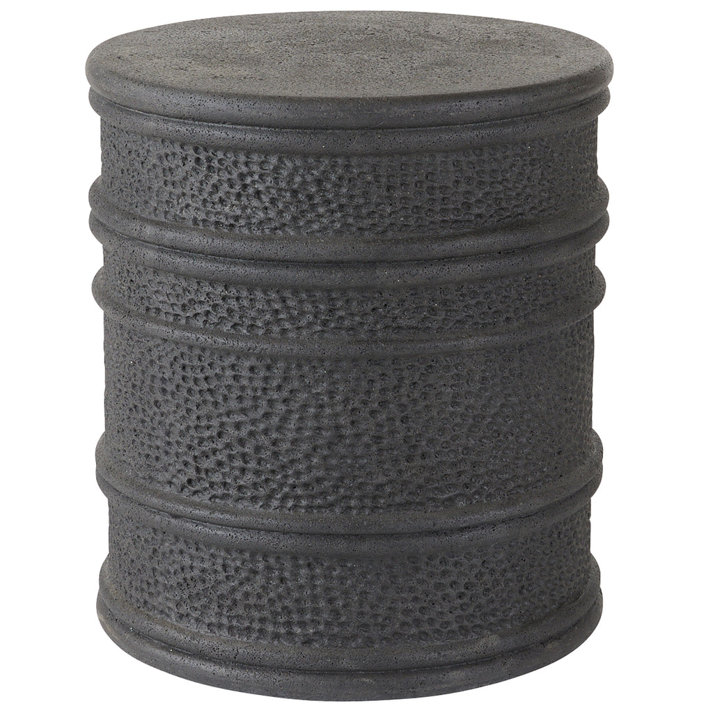 We took a cue from the silhouette of a well-worn wine cask for a barrel-shaped table of black volcanic rock composite. Layers of banding around the drum silhouette and hammered insets create a pleasing visual balance.