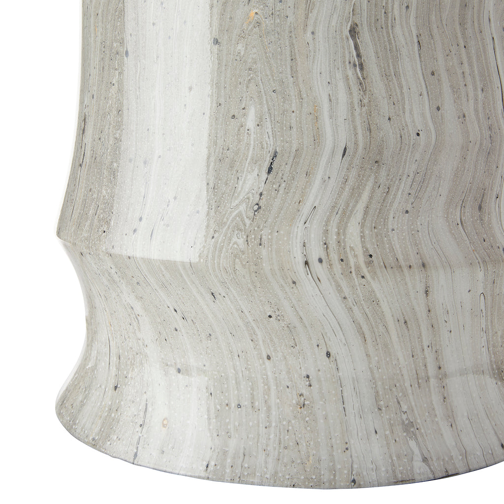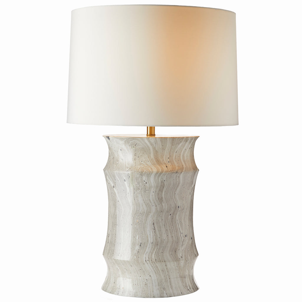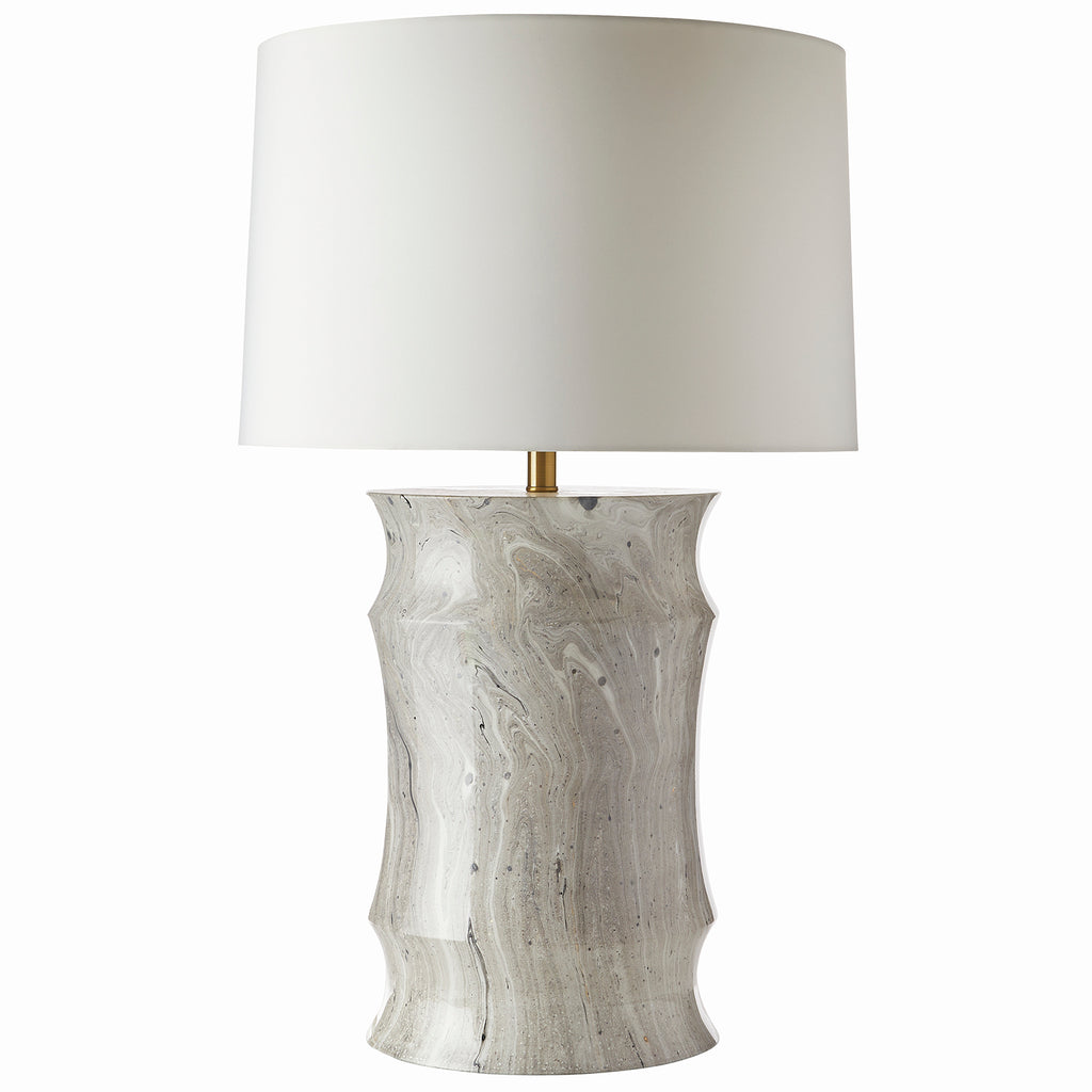 The naturally curved form of a bamboo stalk influenced this over-scaled style. Crafted of hydroprint resin in a moon storm shade, the subtle gradations in color are complemented by antique brass hardware. Off-white microfiber drum shade and antique brass finial. Finish will vary.