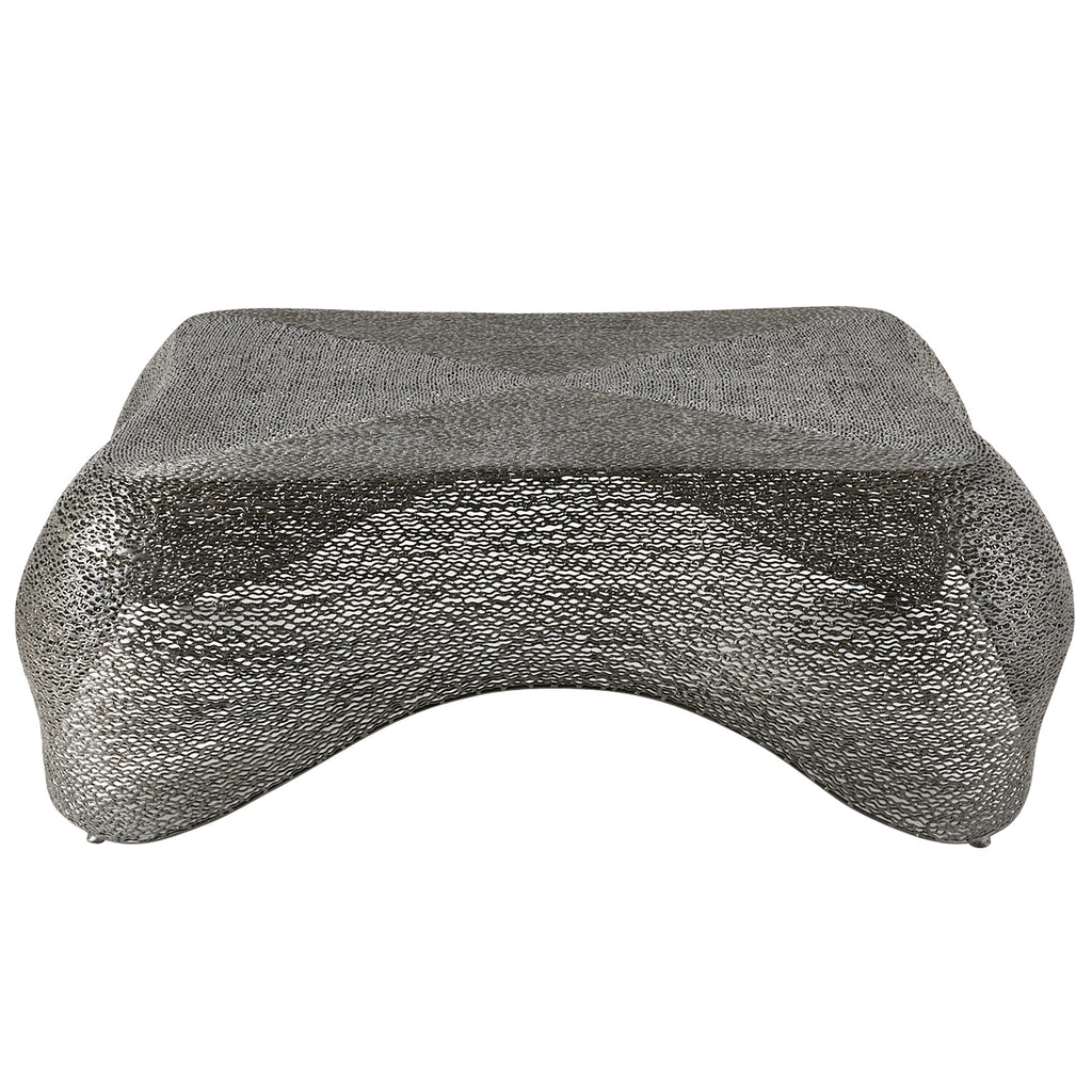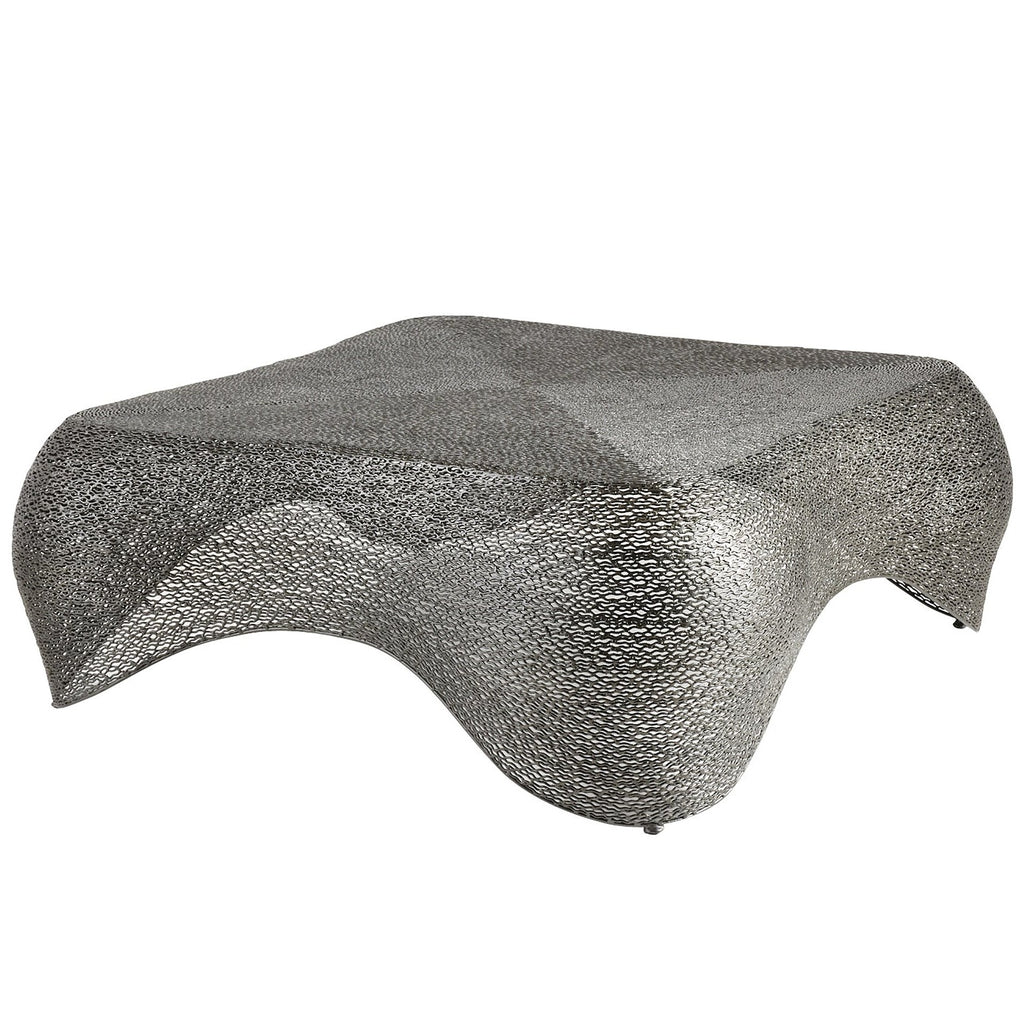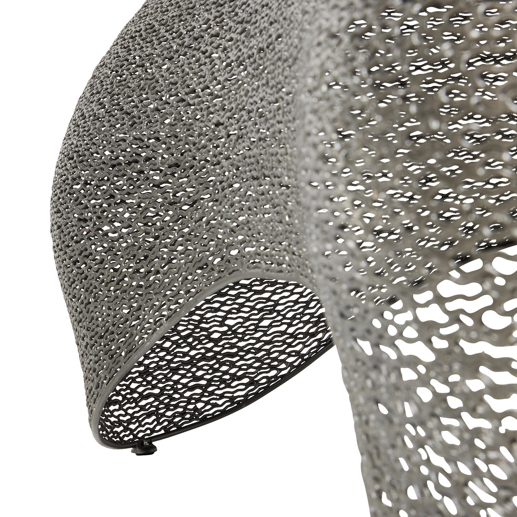 Formed of galvanized iron in a graphite shade, this table plays with transparency in an intriguing fashion. Designed to undulate around the entire structure, its webbed texture recalls the curves of a transparent jellyfish.