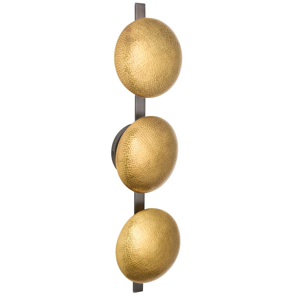 A natural iron flat bar anchors three vintage brass hammered plates in this six-light sconce—each disc conceals two sockets, offering balanced illumination whether placed horizontally or vertically. The finish will vary.