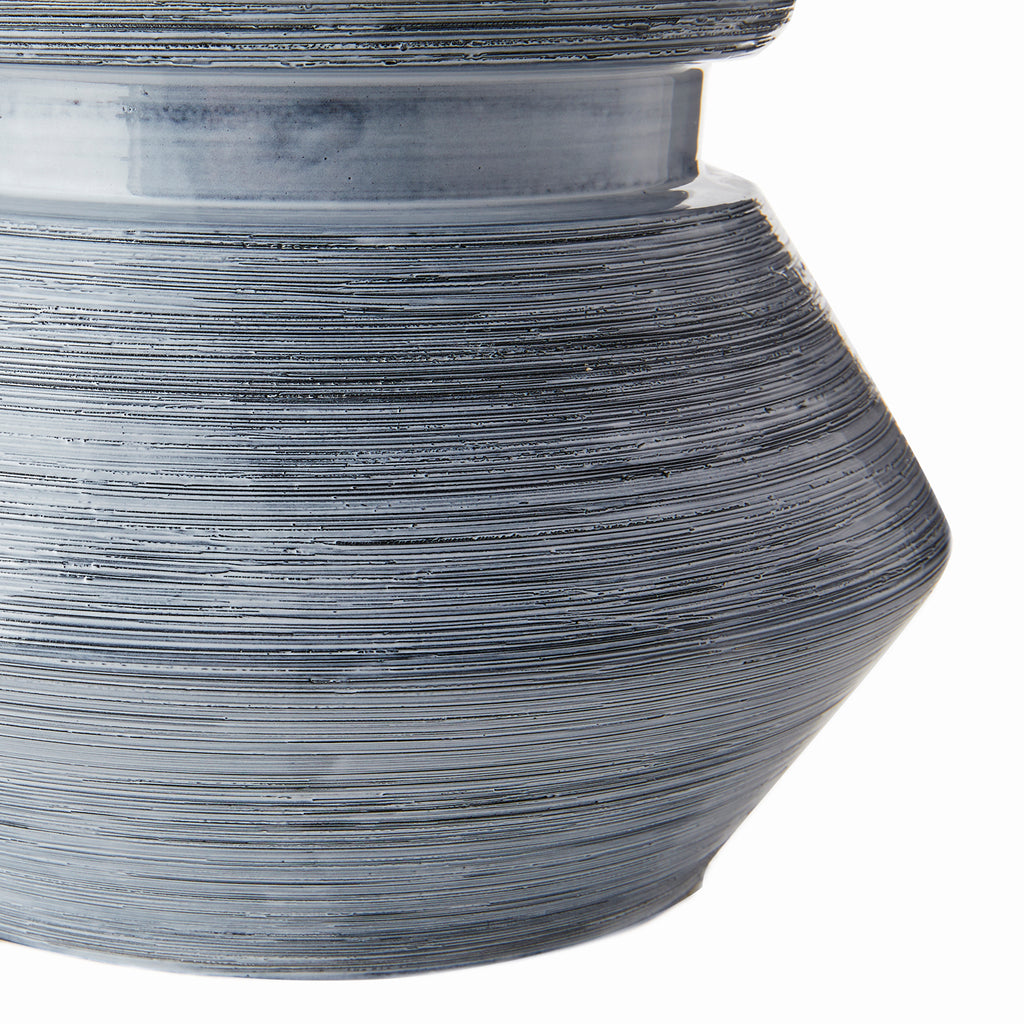 Totemic forms are stacked and structured to become more than the sum of their parts in this impactful ceramic style. Glazed in haze blue with a horizontal grooved texture, the Arteriors Drifter Table Lamp is finished with an antique brass finial and an oval shade of ivory microfiber. Finish will vary.