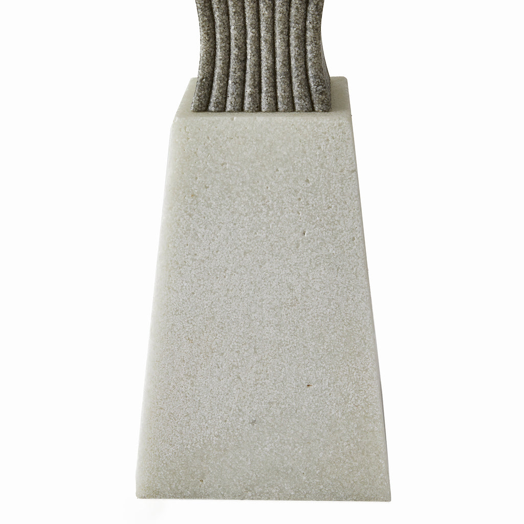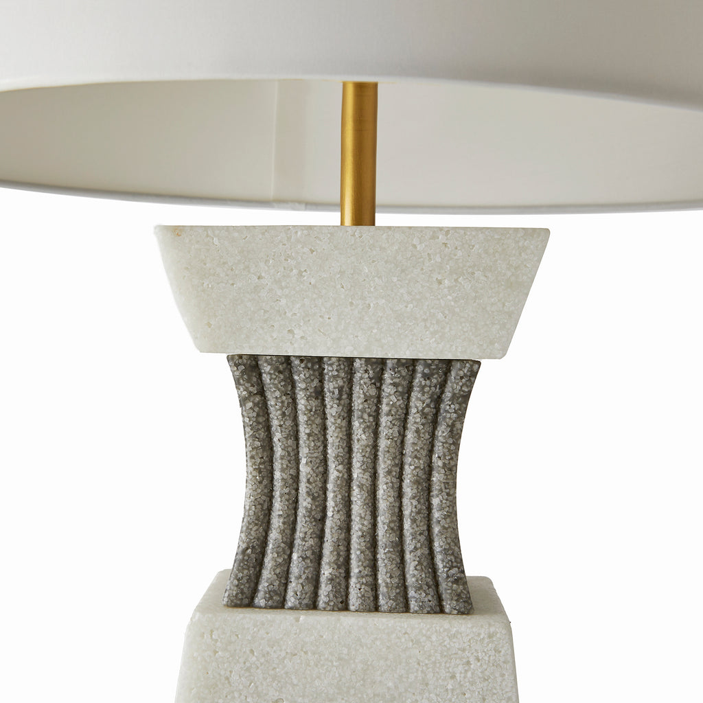 Classical in origin, our ivory ricestone lamp resembles a greek pillar. Modernizing sacred geometry, a grooved inset of graphite gray contrasting stone accents the cinched silhouette. Antique brass hardware and drum shade of off-white microfiber. Finish will vary.