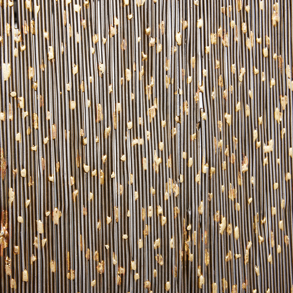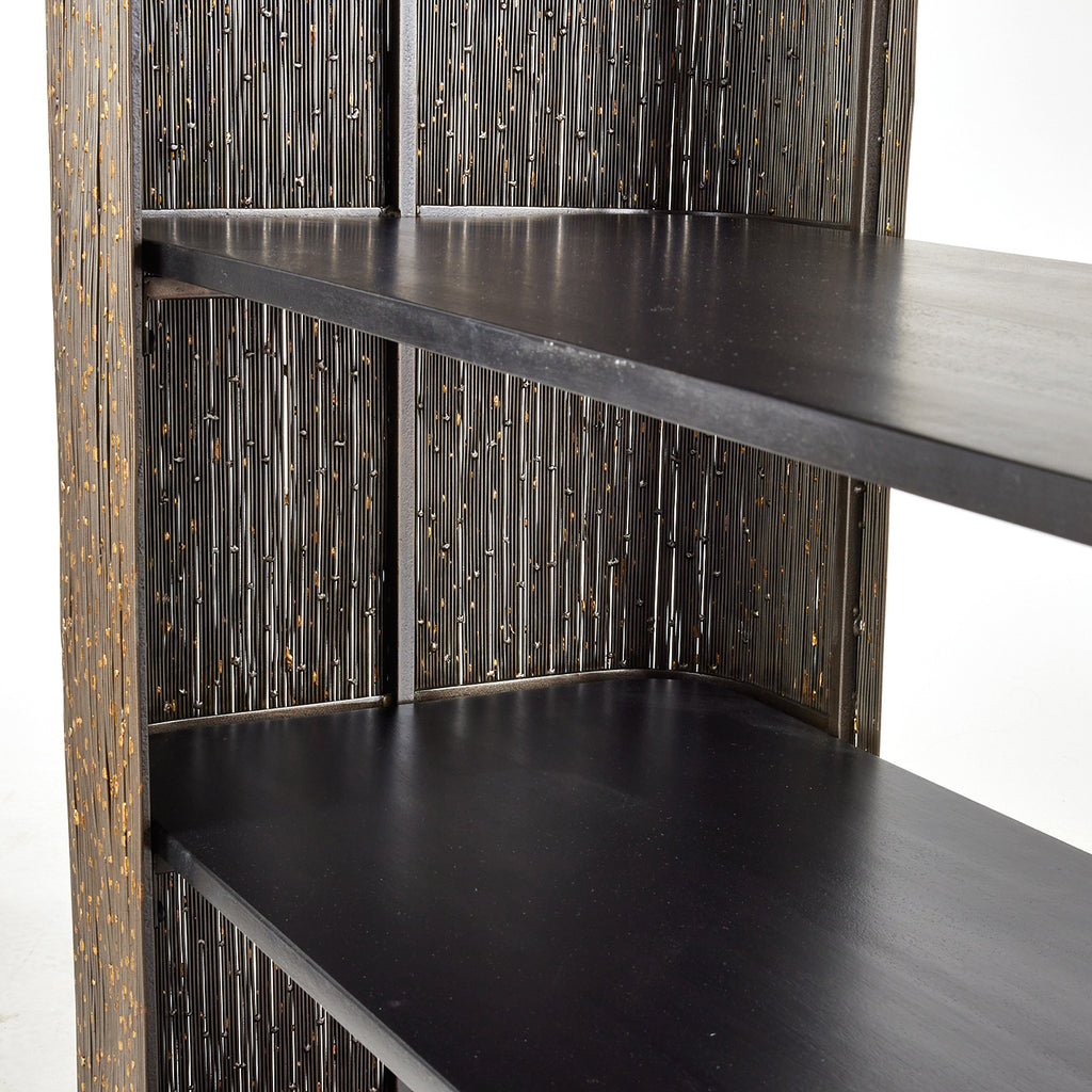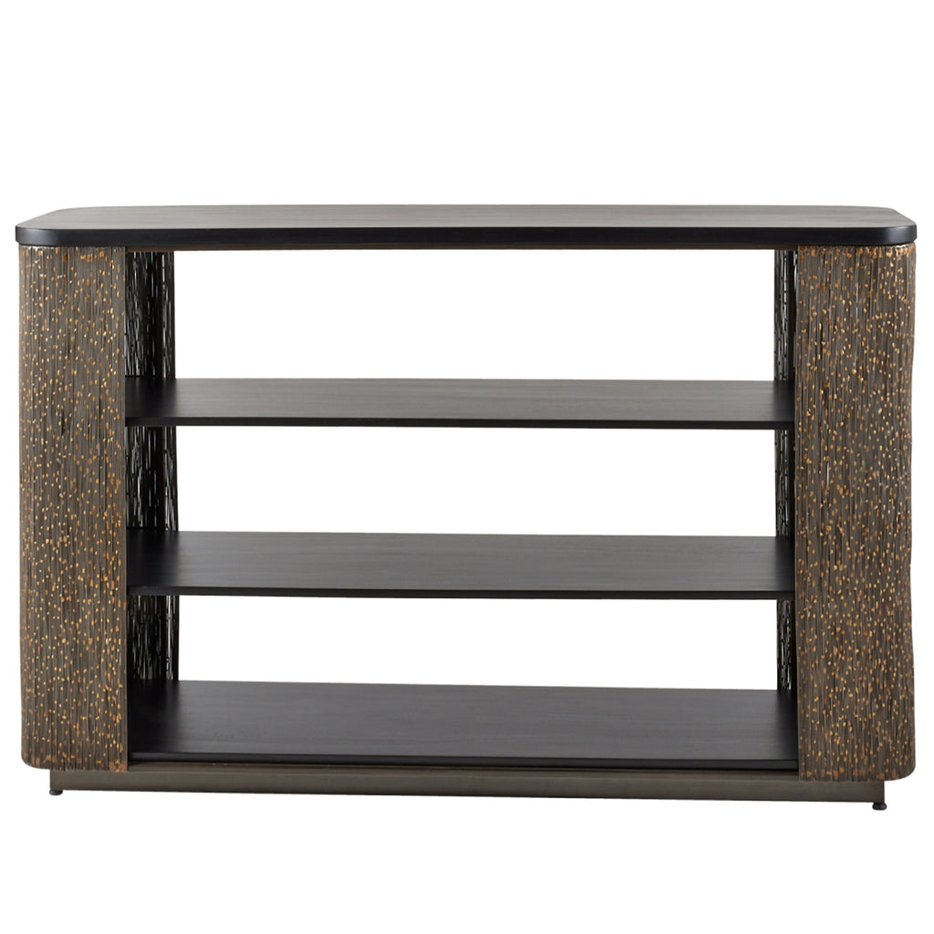 Deco-inspired lines and natural forms make a match on an intriguing low shelf. Four natural iron shelves are secured and adorned with shimmering antique brass welds. This translucent, star-studded effect will elevate any collection. Finish will vary.