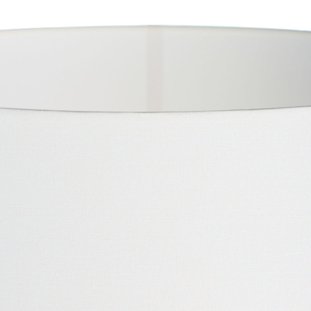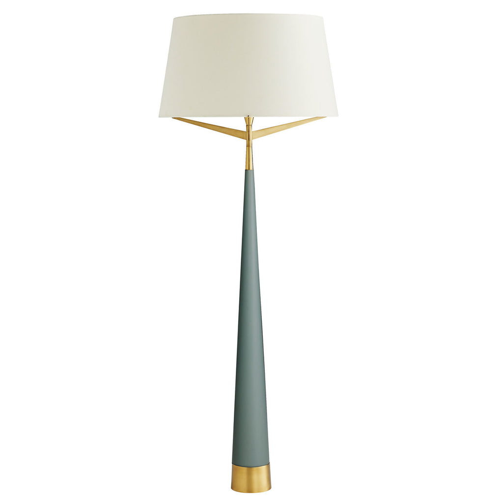 A new interpretation of our Elden, this conical-shaped floor lamp in a bold cadet blue iron. Simple and modern, the base is accented with antique brass-plated iron hardware and topped with a unique spider-like frame that supports the white linen drum shade, lined in white cotton.