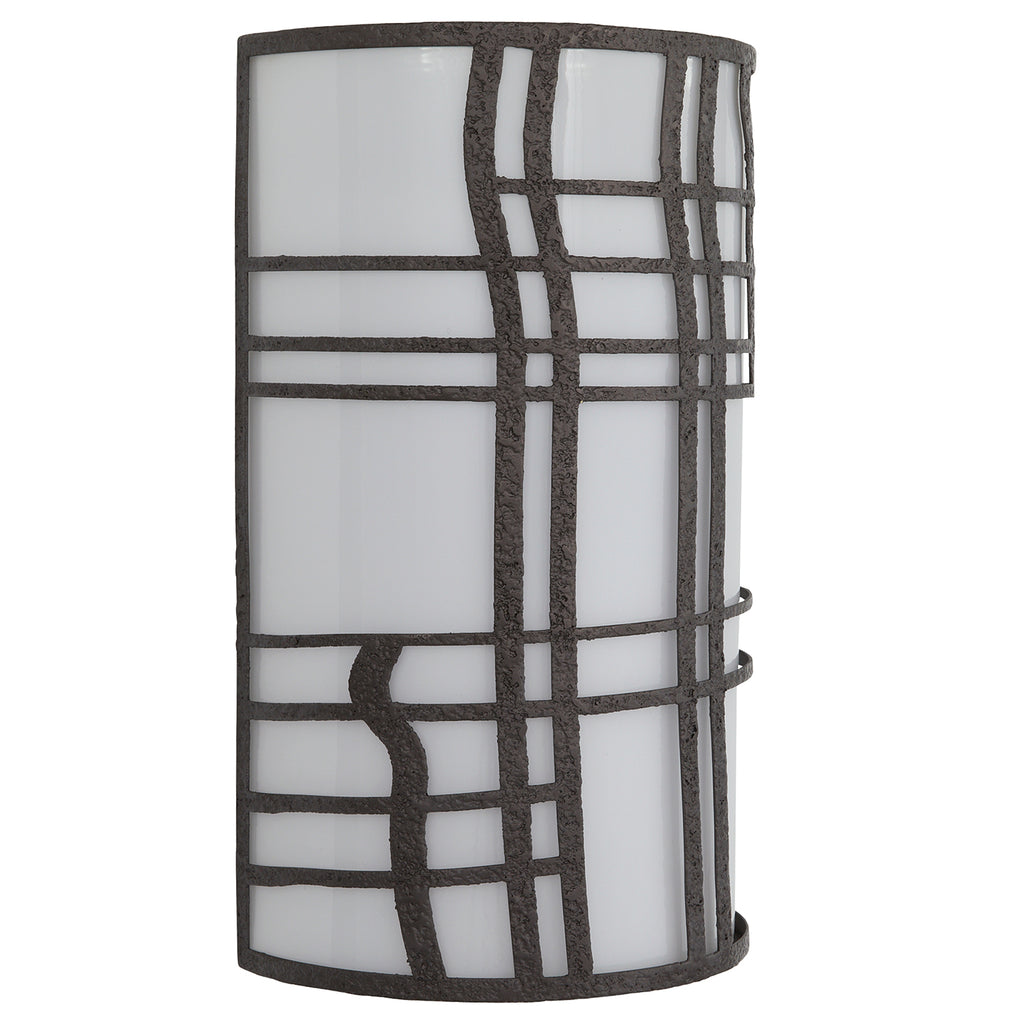 Reminiscent of woven textiles, a lattice sconce embraces a cylinder of opal glass. The hammered textured of its aged iron frame recalls the hand-formed designs of the arts and crafts movement. The Arteriors Elmwood Outdoor Lantern is not suitable for use in coastal or marine environments. Finish will vary.